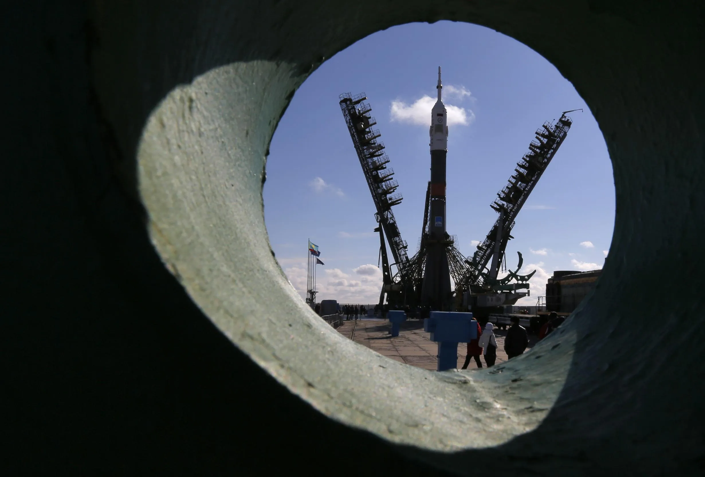 Russia's Soyuz-FG booster rocket with the space capsule Soyuz TMA-16M that will carry a new crew to the International Space Station (ISS) is photographed at the launch pad in Russian leased Baikonur cosmodrome, Kazakhstan, Wednesday, March 25, 2015. (Photo by Dmitry Lovetsky/AP Photo)