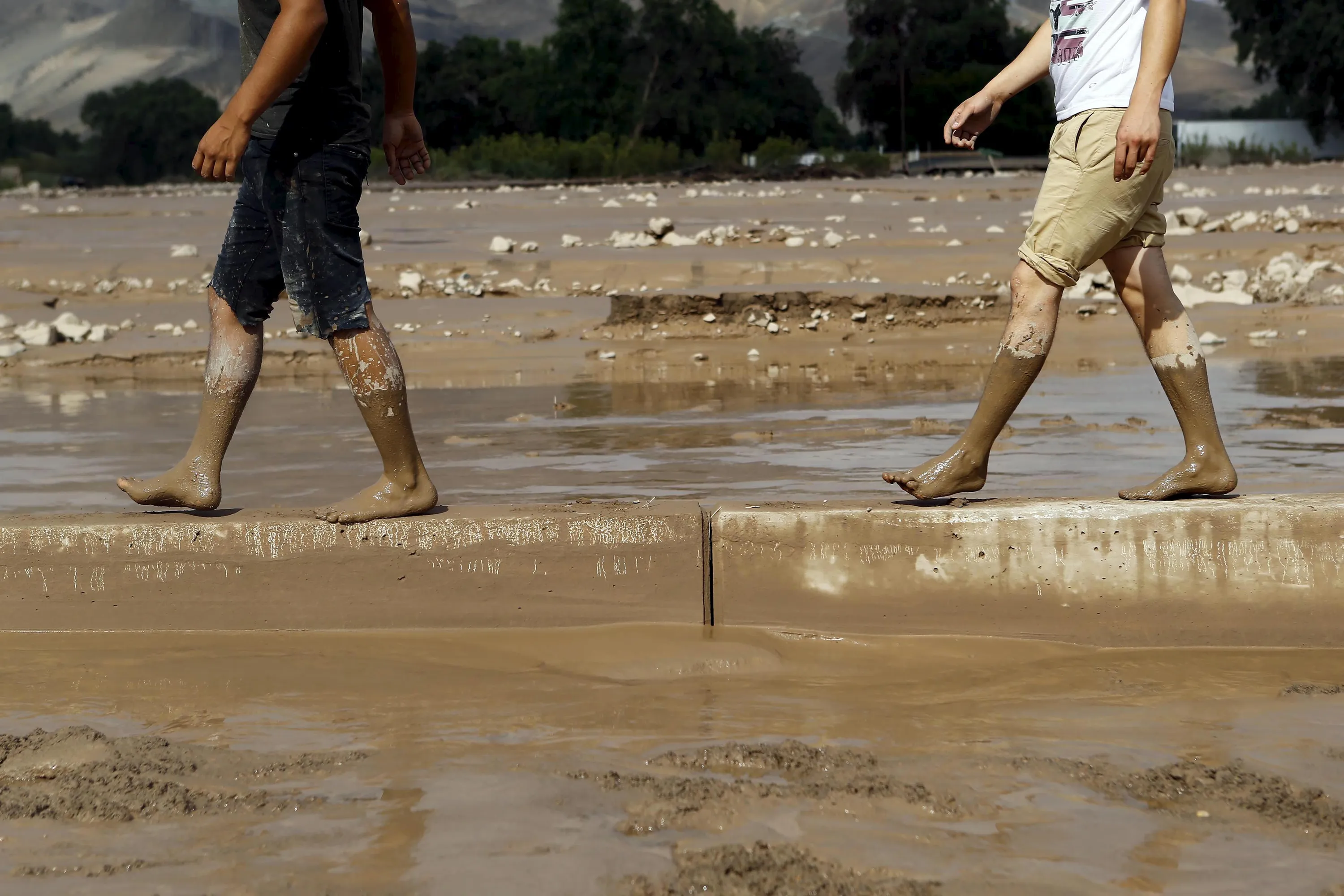 Locals walk on a road barrier on a flooded street at Copiapo city, March 26, 2015. (Photo by Ivan Alvarado/Reuters)