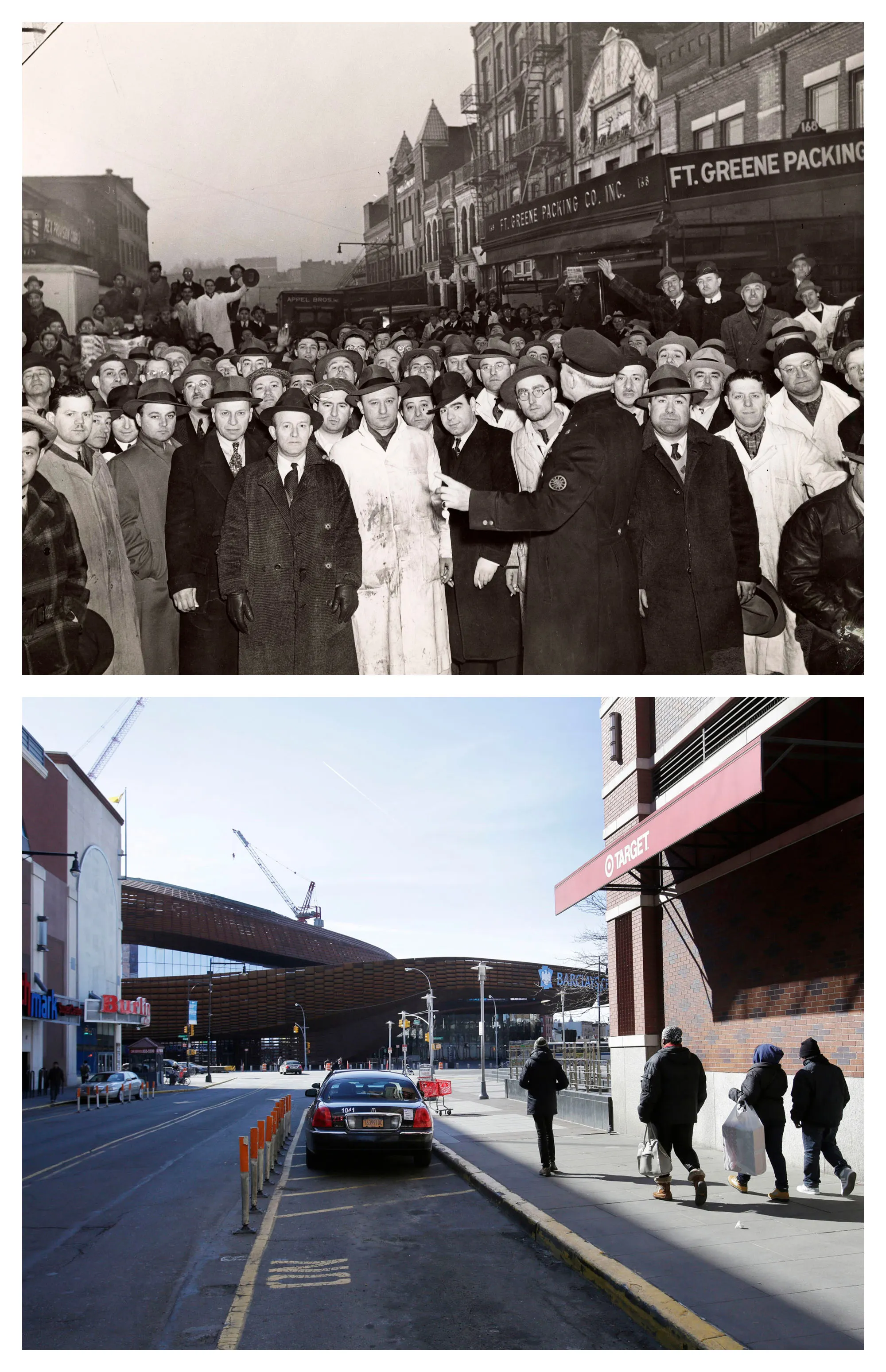 This combination shows the March 18, 1943 photo “Wartime rationing: retail butchers await arrival of meat” by Weegee, provided by the International Center of Photography in New York, and at the same vantage point, the Atlantic Mall, right, and the Barclay's Center, background, in the Brooklyn borough of New York on Monday, March 23, 2015. (Photo by AP Photo/Copyright Weegee/The International Center of Photography, Mark Lennihan)