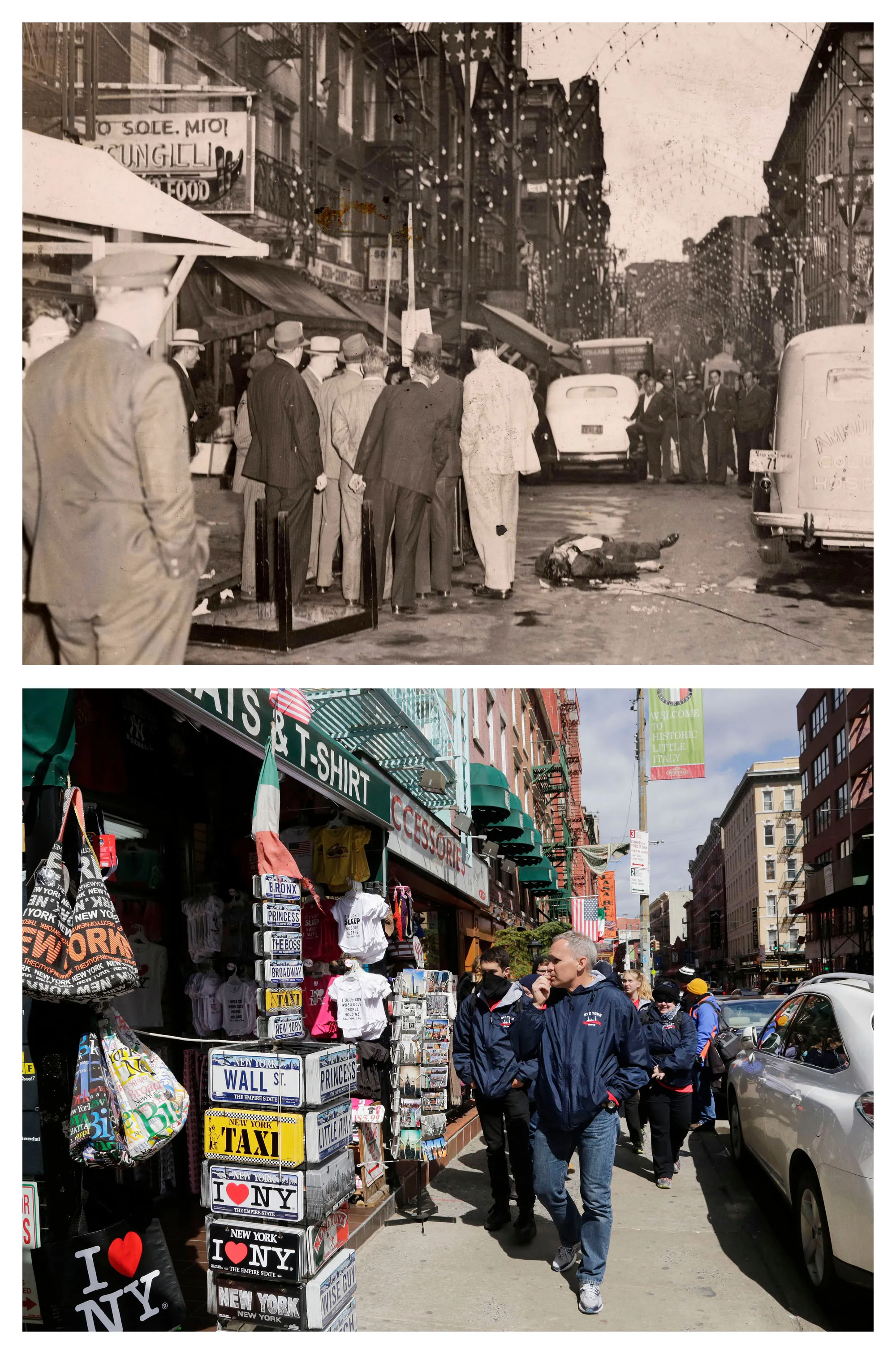 This combination of the Sept. 21, 1939 photo “Fiesta turns into tragedy” by Weegee provided by the International Center of Photography shows a murder victim lying on Mulberry Street in the Little Italy neighborhood of New York, and from the same vantage point, pedestrians on Wednesday, March 18, 2015. (Photo by AP Photo/Copyright Weegee/The International Center of Photography, Mark Lennihan)