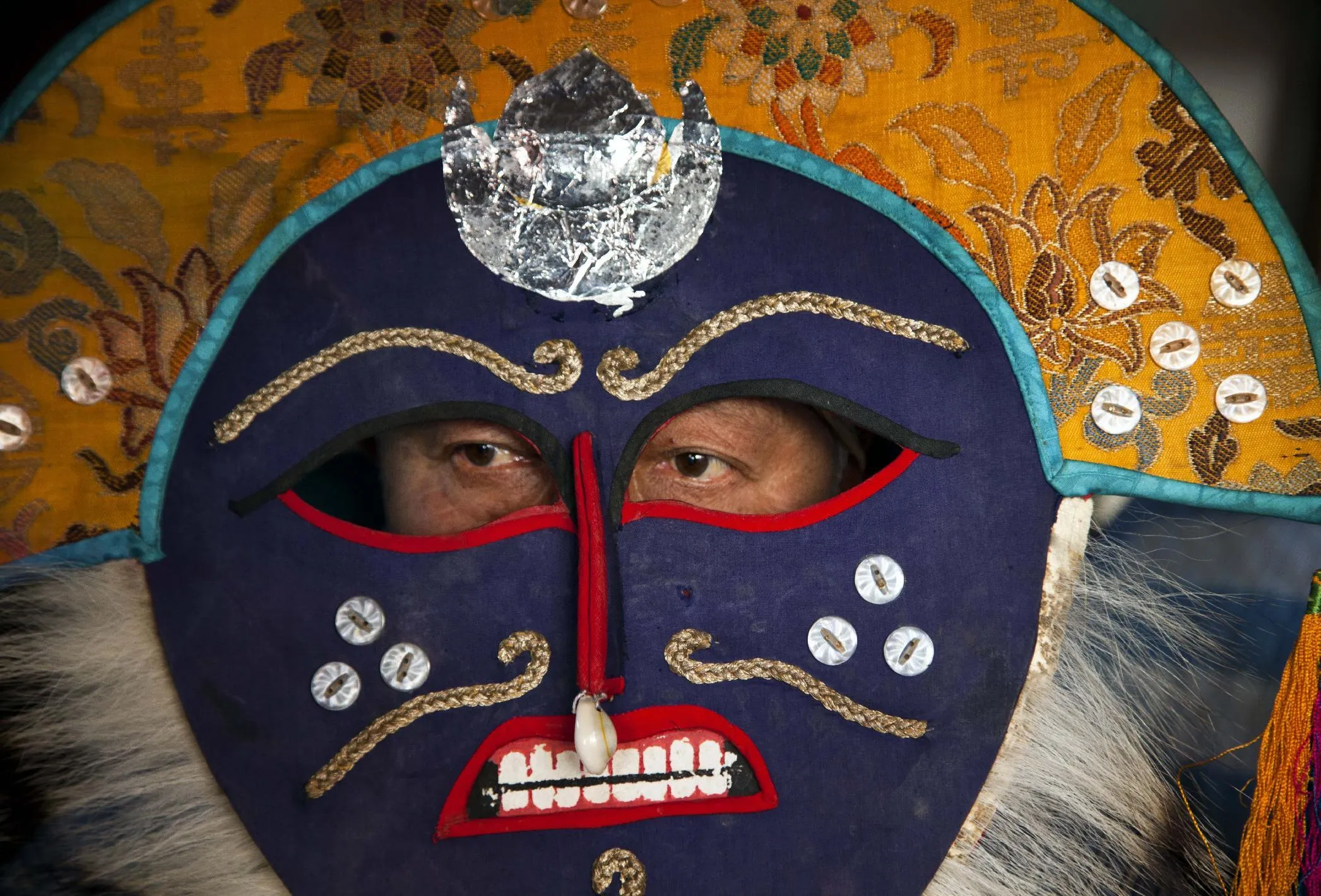 A masked Tibetan artist waits to perform a traditional opera at the Tibetan Institute of Performing Arts in Dharmsala, India, Friday, March 27, 2015. (Photo by Ashwini Bhatia/AP Photo)