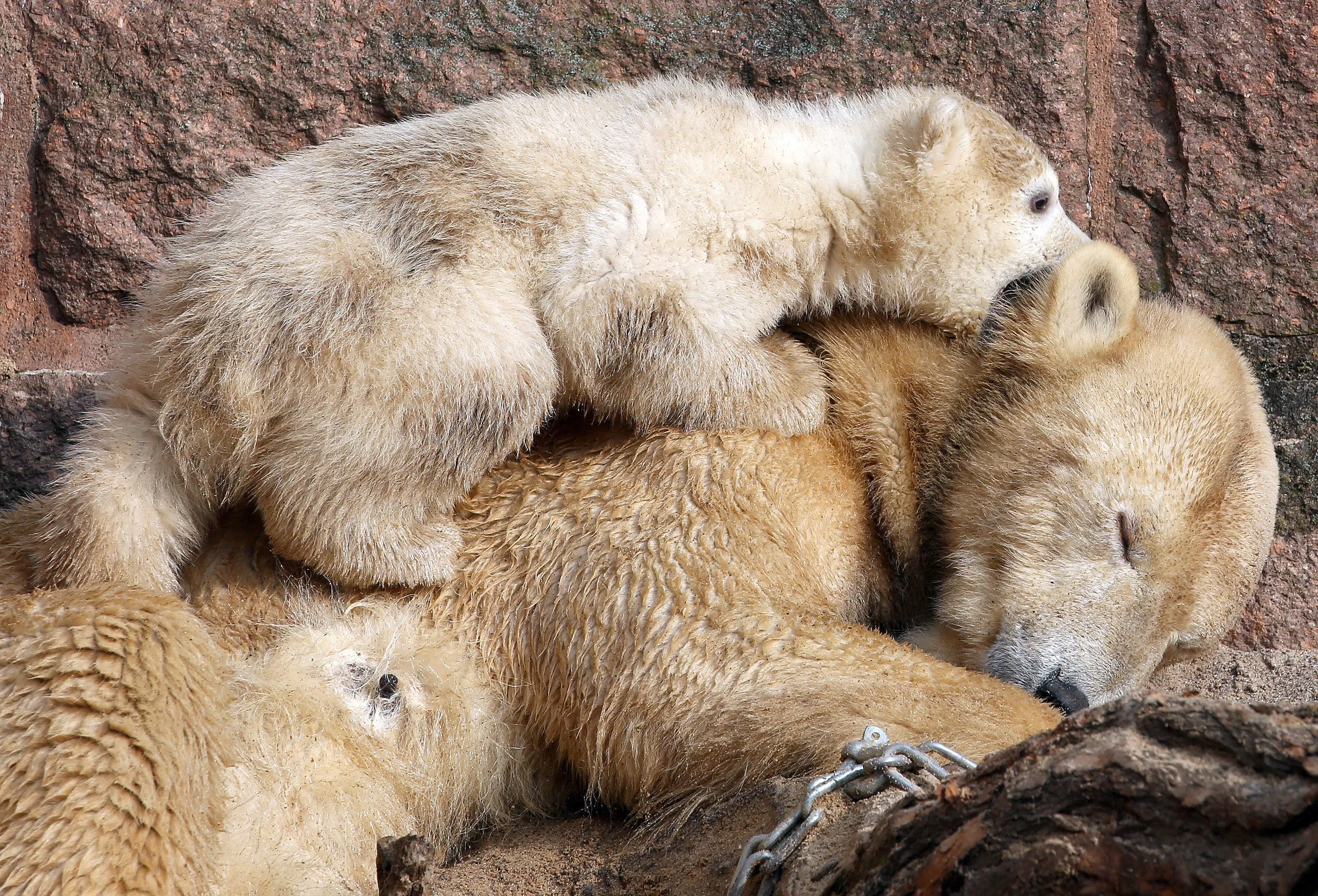 A yet unnamed polar bear cub is out and about with its mother “Vilma” for the first time in their enclosure at the zoo in Rostock, Germany, 25 March 2015. The 3.5 months old polar bear cub weights just about 20 kg and is to be baptized on 31 March 2015. (Photo by Bernd Wuestneck/EPA)