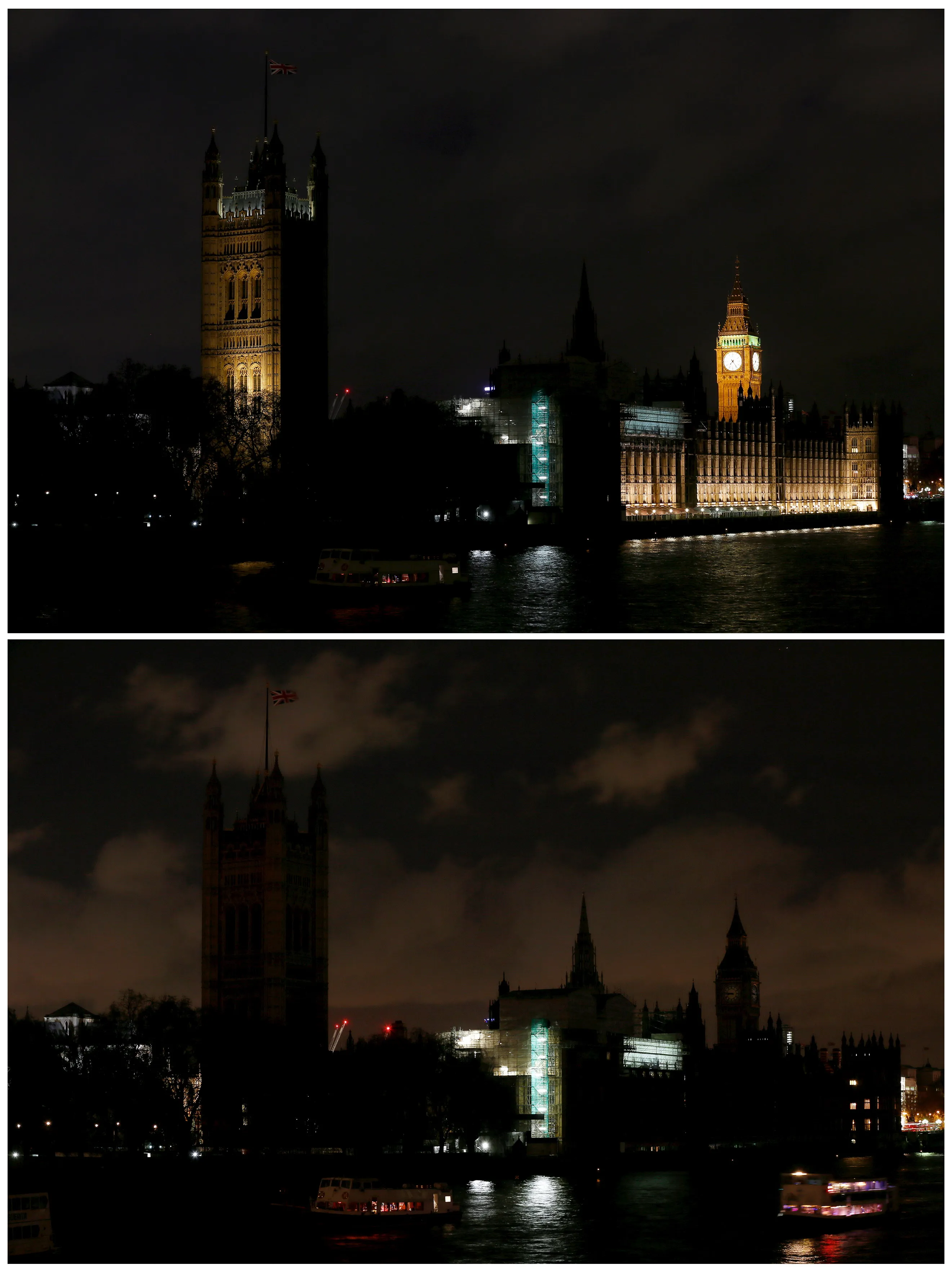 A combination picture shows Big Ben and the Houses of Parliament before and during Earth Hour in central London March 28, 2015. (Photo by Stefan Wermuth/Reuters)