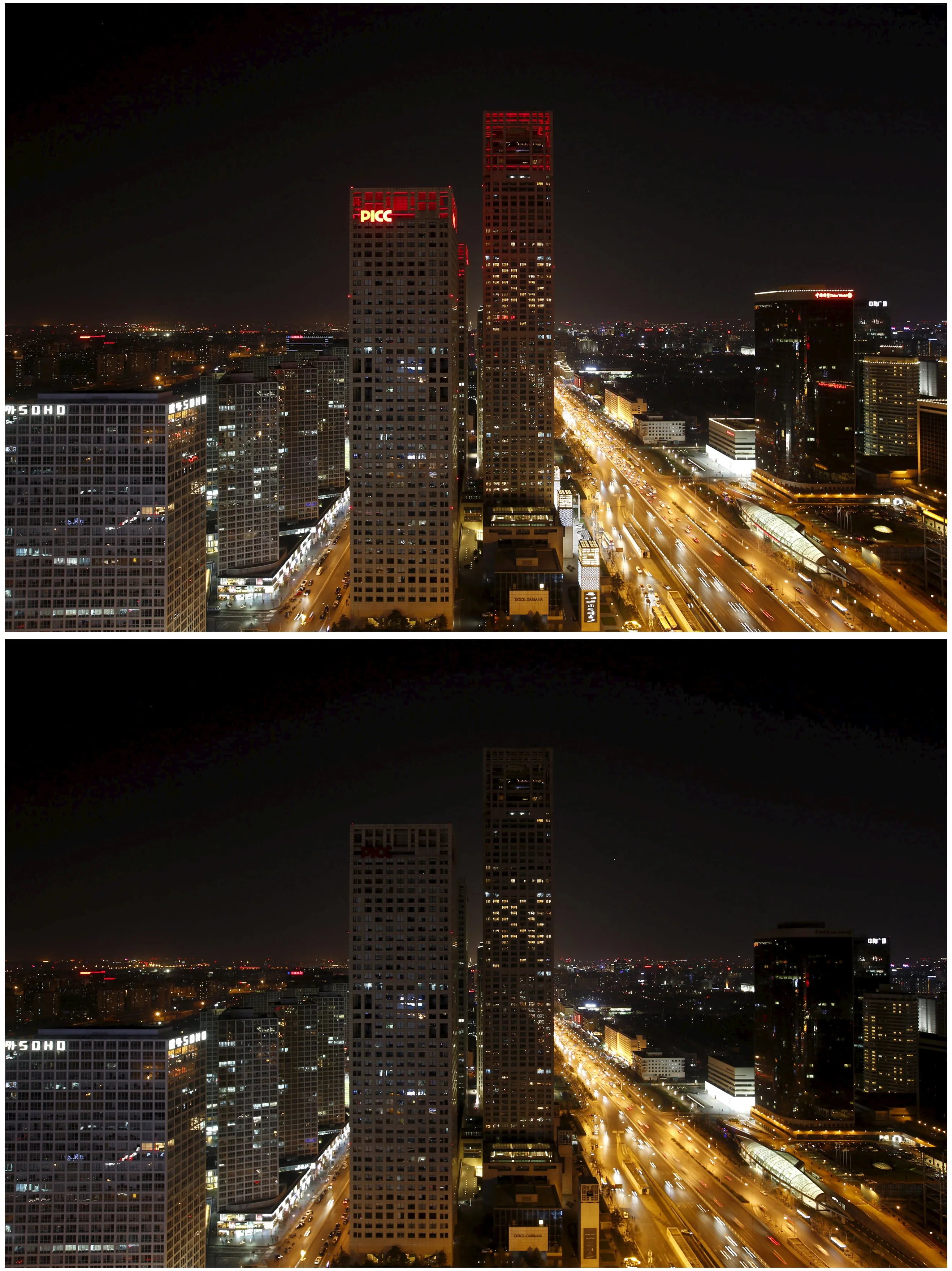 Combination picture shows Yintai Centre buildings before and during Earth Hour, when they turn off the red lights on the tops, in Beijing's central business district, March 28, 2015. (Photo by Kim Kyung-Hoon/Reuters)