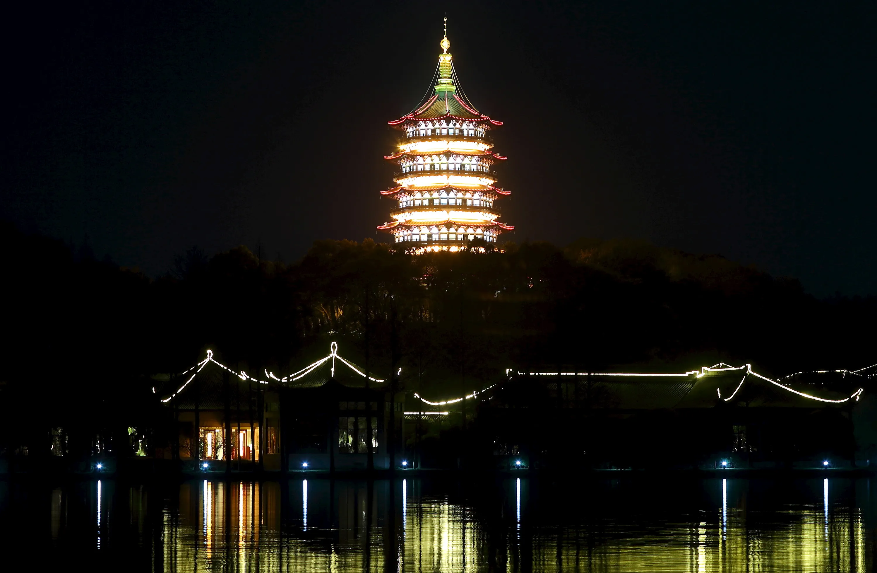 Leifeng Pagoda is seen behind the West Lake before Earth Hour in Hangzhou, Zhejiang province, March 28, 2015. (Photo by Chance Chan/Reuters)