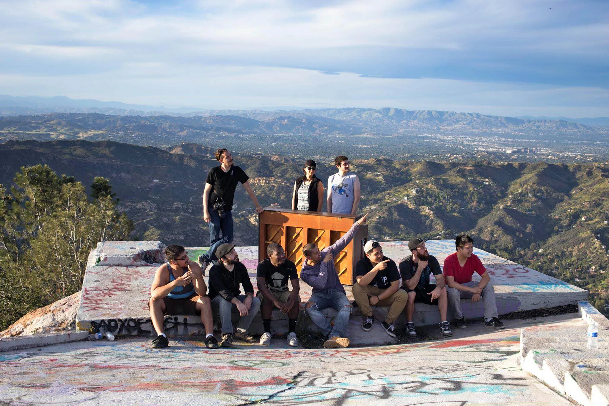 In this March, 2015 photo, members of a music video crew pose at Topanga Lookout in the Santa Monica Mountains with an upright piano they hauled up there in Calabasas, Calif. (Photo by Michael Flotron/AP Photo)