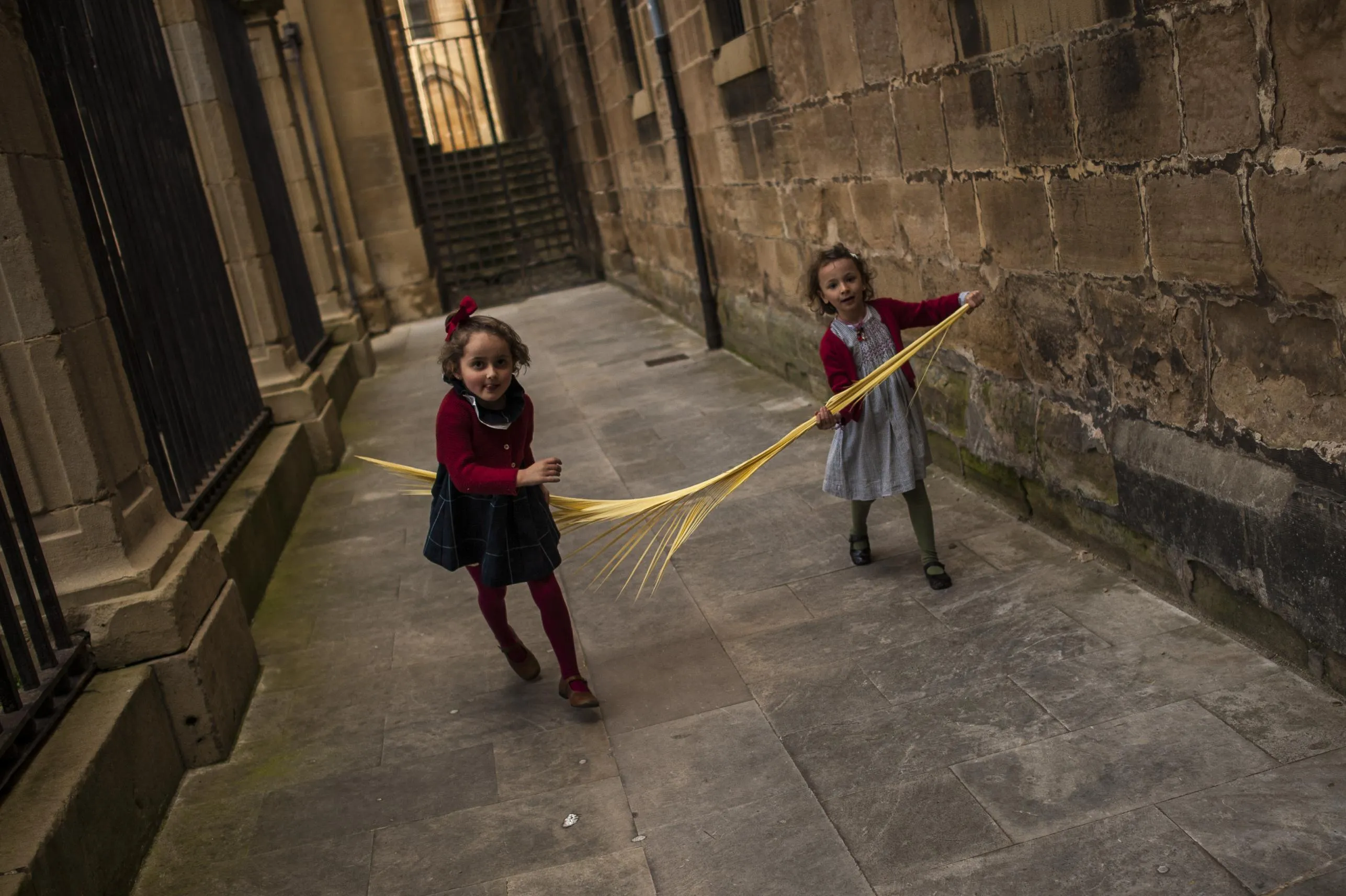 Two young girls play with their palm as they take part in a procession during Palm Sunday, a few days prior to Holy Week, in Pamplona northern Spain, Sunday, March 29, 2015. (Photo by Alvaro Barrientos/AP Photo)