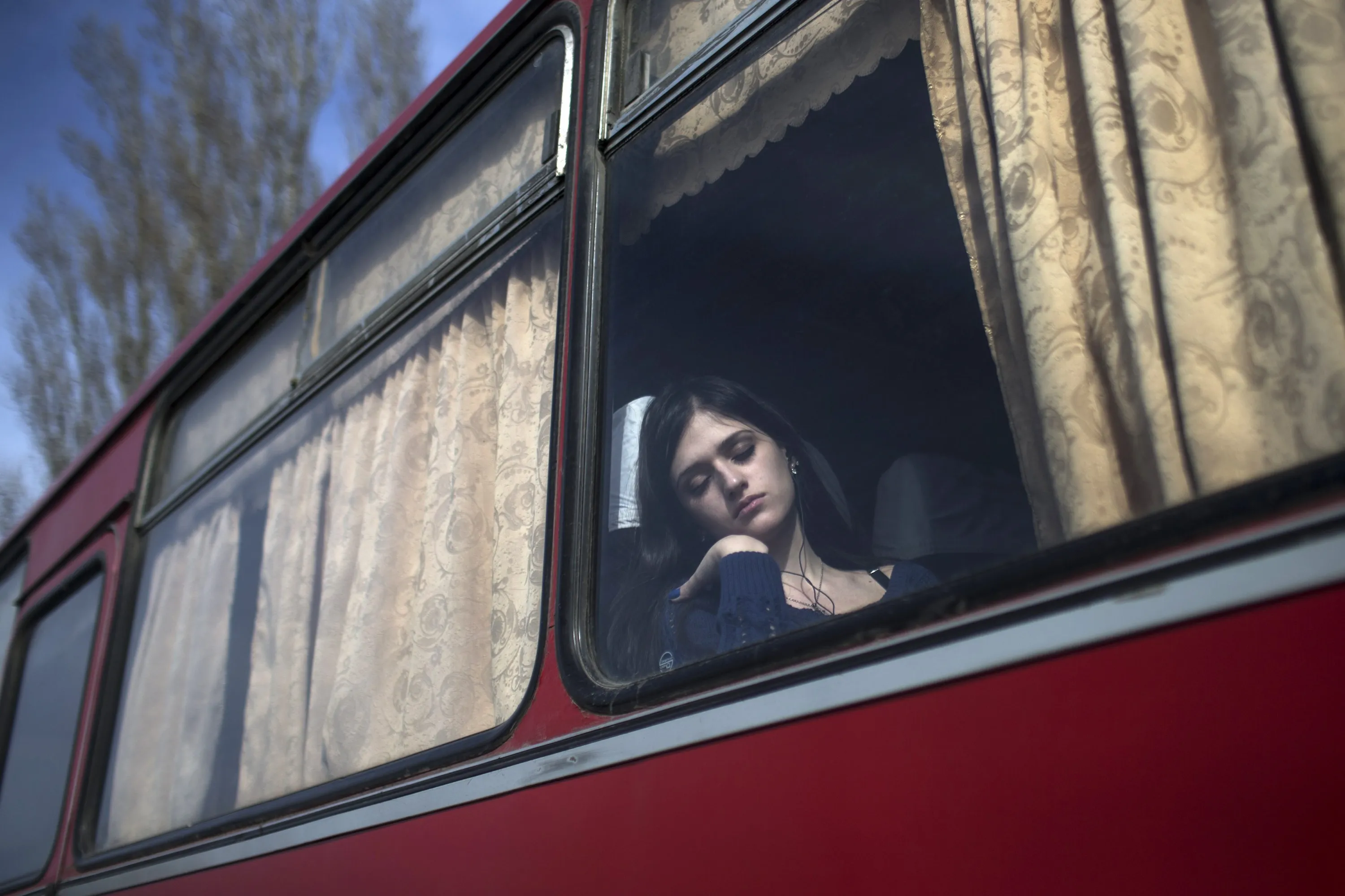 A woman takes a nap inside a bus while waiting to cross the Uspenka border crossing between Ukraine and Russia, southeast from Donetsk March 15, 2015. (Photo by Marko Djurica/Reuters)