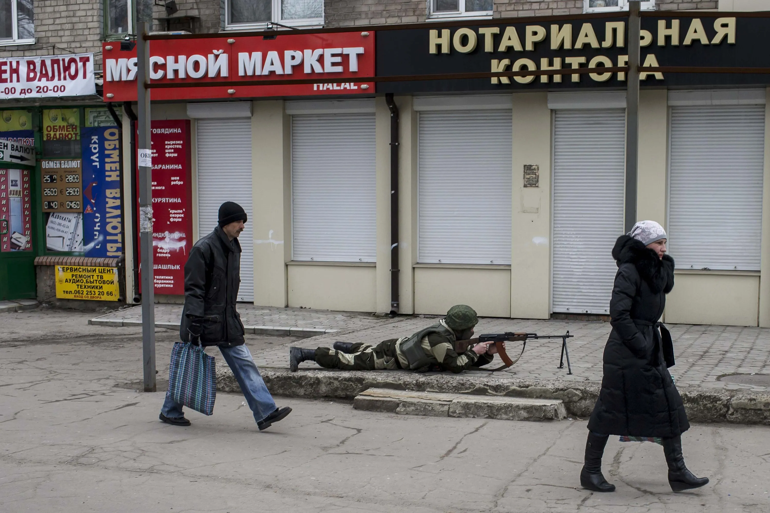A pro-Russian rebel aims his weapon as people pass by, during what the rebels said was an anti-terrorist drill in Donetsk, March 18, 2015. (Photo by Marko Djurica/Reuters)