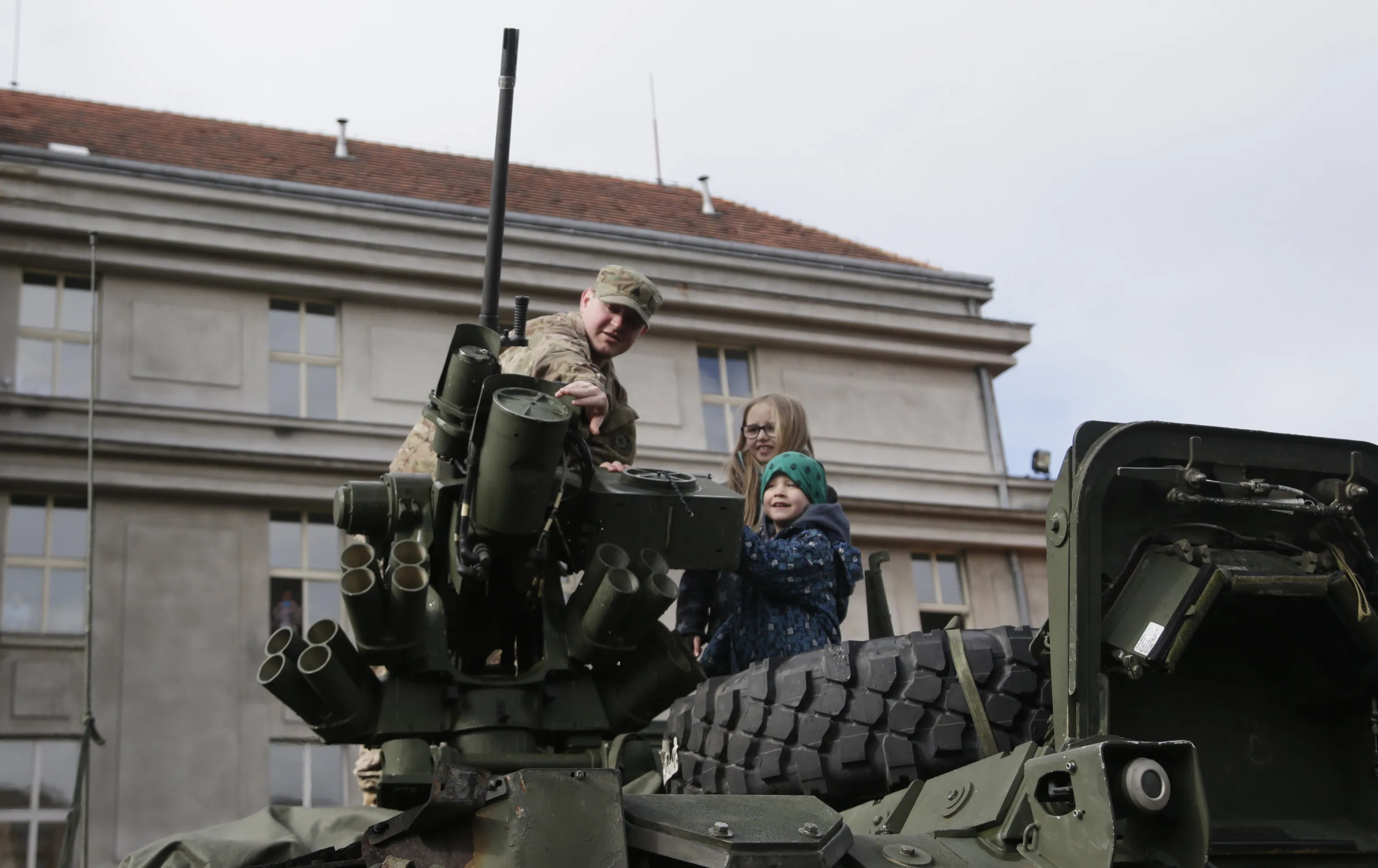A US army soldier shows a gun mounted on top of a stryker armored vehicle to children during a stop of his convoy in Prague, Czech Republic, Tuesday, March 31, 2015. (Photo by Petr David Josek/AP Photo)