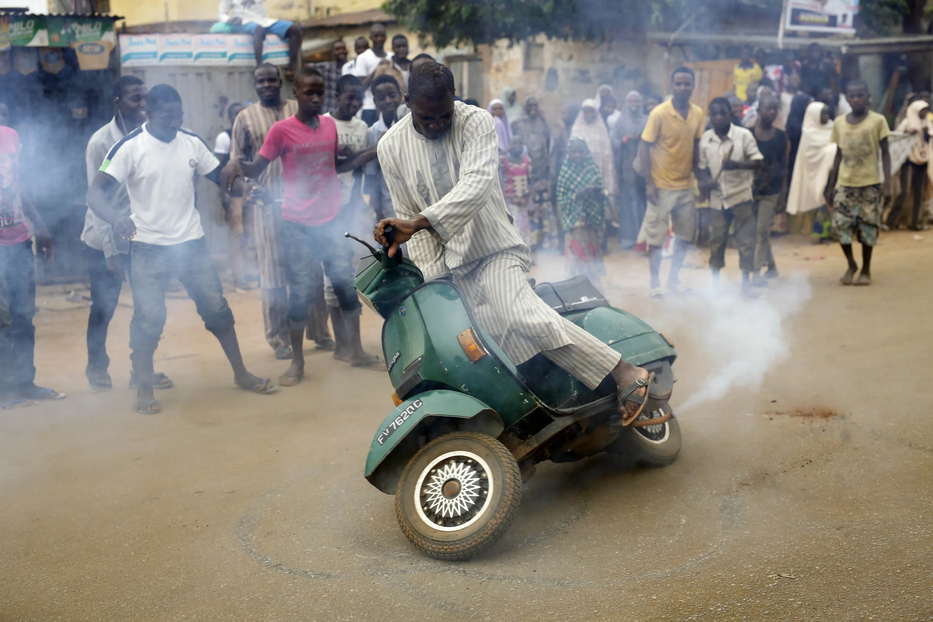 Nigerians celebrate the anticipated victory of Presidential candidate Muhammadu Buhari by doing a burnout on a scooter in Kaduna, Nigeria Tuesday, March 31, 2015. (Photo by Jerome Delay/AP Photo)