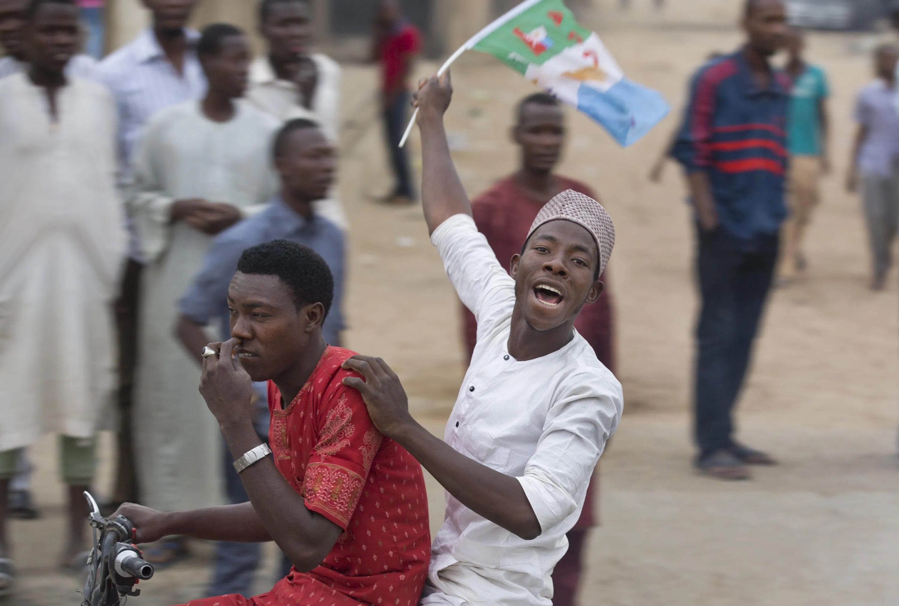 Supporters of opposition candidate Muhammadu Buhari riding on a motorcycle celebrate an anticipated win for their candidate, in Kano, Nigeria Tuesday, March 31, 2015. (Photo by Ben Curtis/AP Photo)