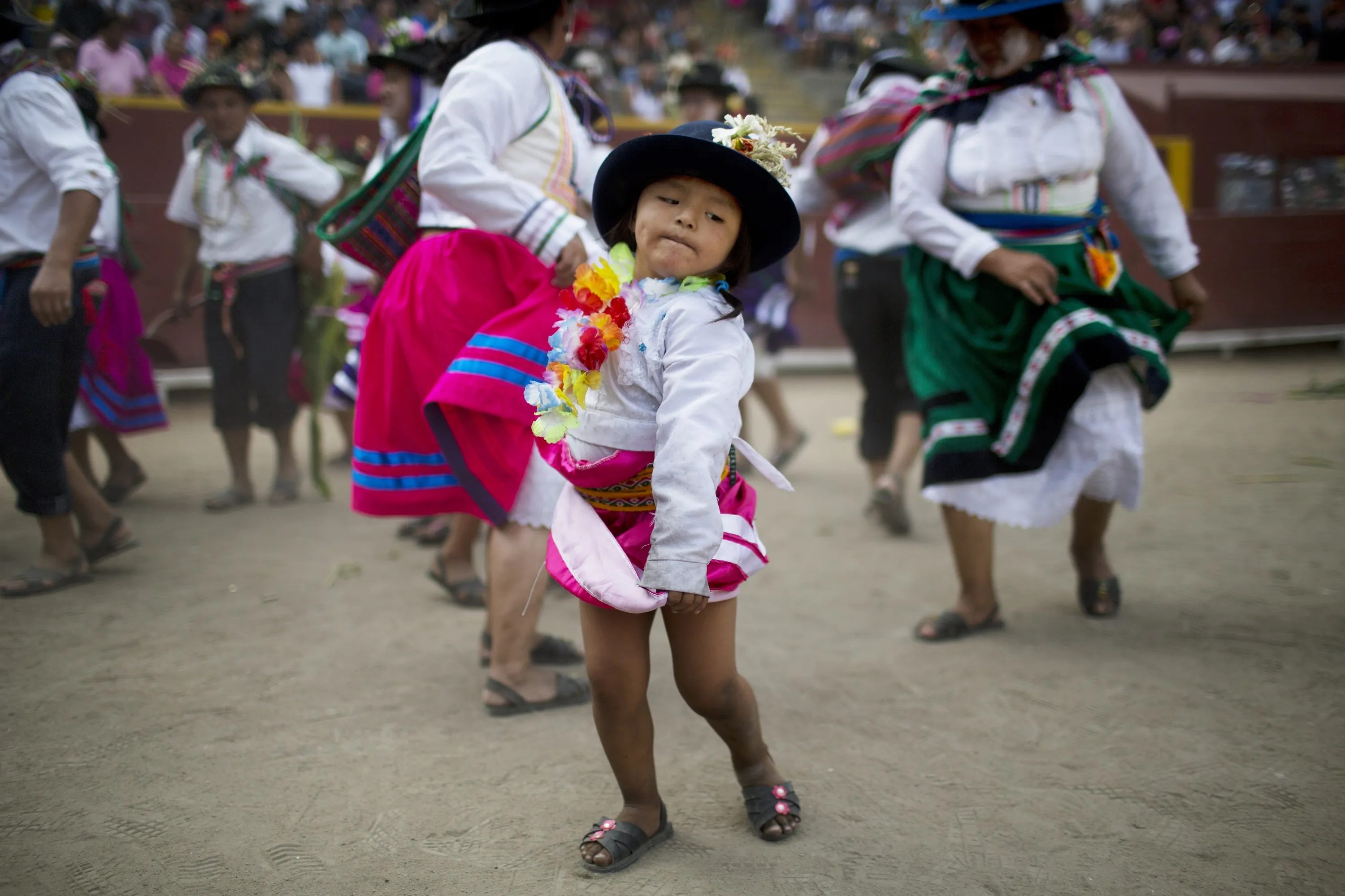 In this Sunday, March 29, 2015 photo, a young performer from the Parinacochas district of Ayacuhco dances in the Vencedores de Ayacucho dance festival, in the Acho bullring in Lima, Peru. The performers sang in the Quechua language, portraying the planting of corn and potatoes. From very young children to elderly people dressed as farmers, tigers, and foxes, as well as members of auto-defense groups, soldiers and police officers, to portray the violence that tore apart their families and communities. (Photo by Rodrigo Abd/AP Photo)