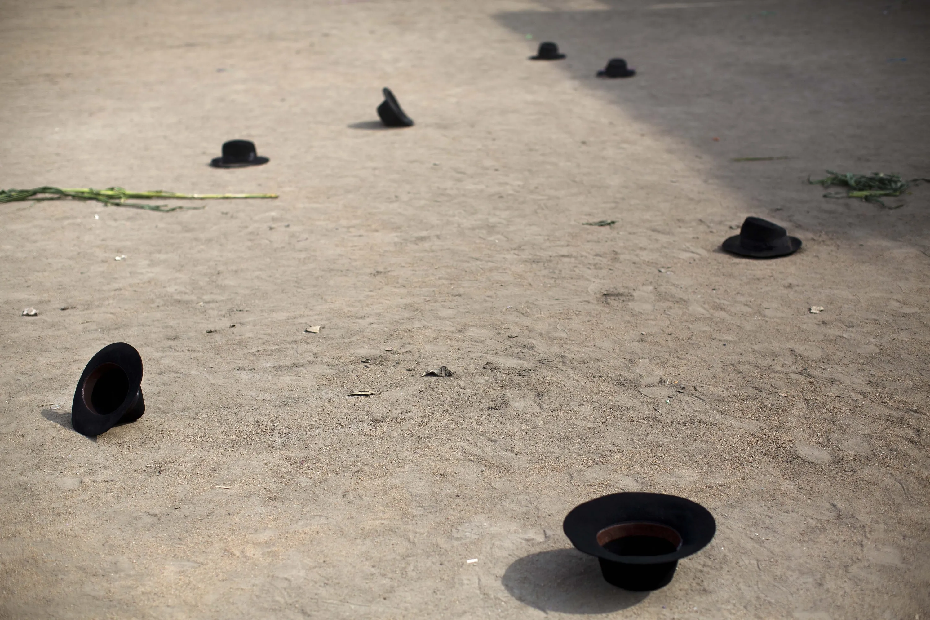 In this Sunday, March 29, 2015 photo, hats lie scattered after being tossed by dancers during a performance at the Vencedores de Ayacucho dance festival, in the Acho bullring in Lima, Peru. “The dance is a catharsis, a way for people to express feelings they cannot in other public spaces”, said Peruvian archaeologist Carmen Cazorla, who studies Andean rituals. The one-day dance competition is the culmination of the Andean Carnival celebrations that begin in late January in Peru's Ayacucho region and wrap up in Lima, to include the large Ayacucho Indian population, who fled to Lima during the 1980-2000 conflict. (Photo by Rodrigo Abd/AP Photo)