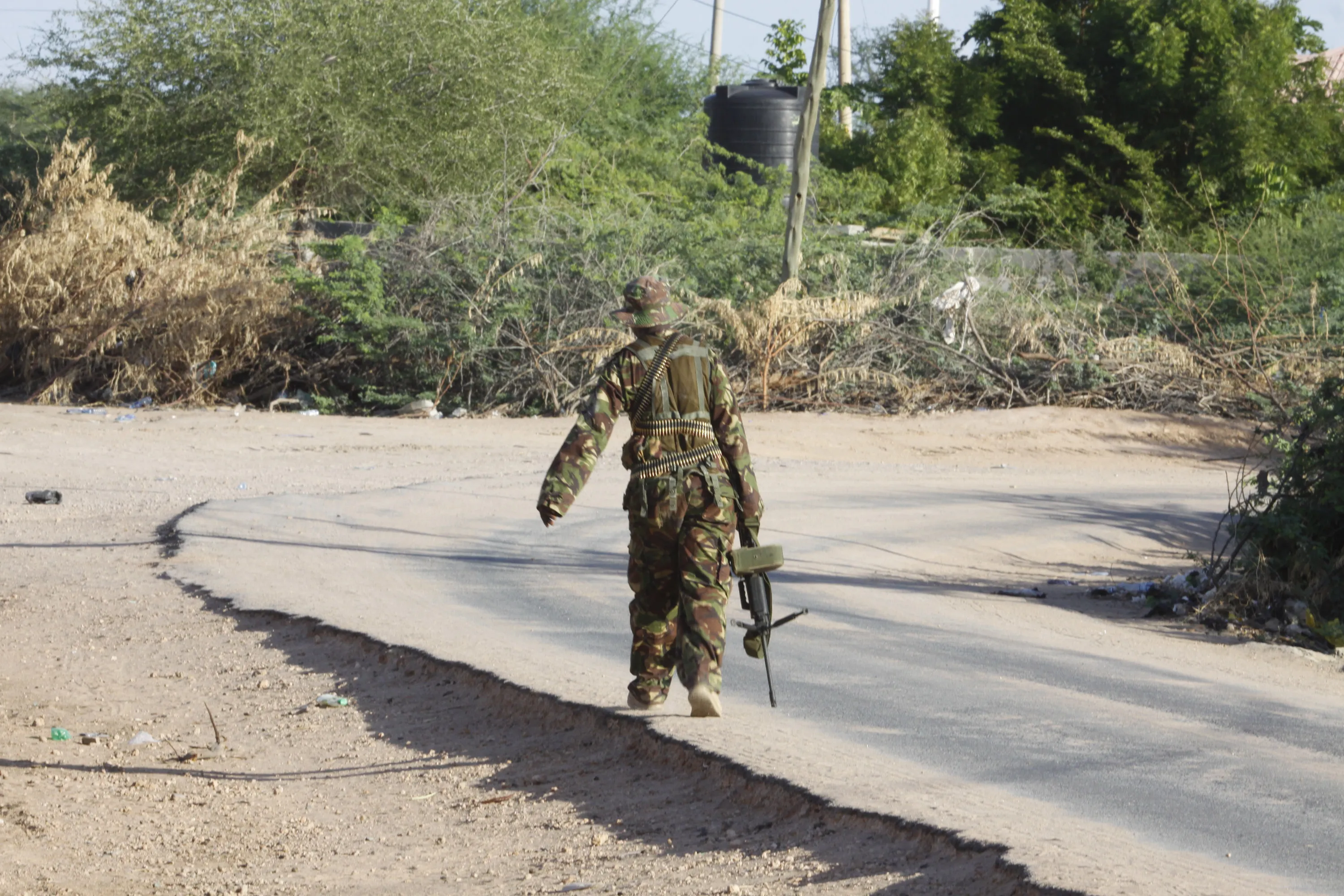 A member of Kenya Defence Forces patrols the area of the Garissa University college, in Garissa, Kenya, Thursday, April 2, 2015. (Photo by Khalil Senosi/AP Photo)