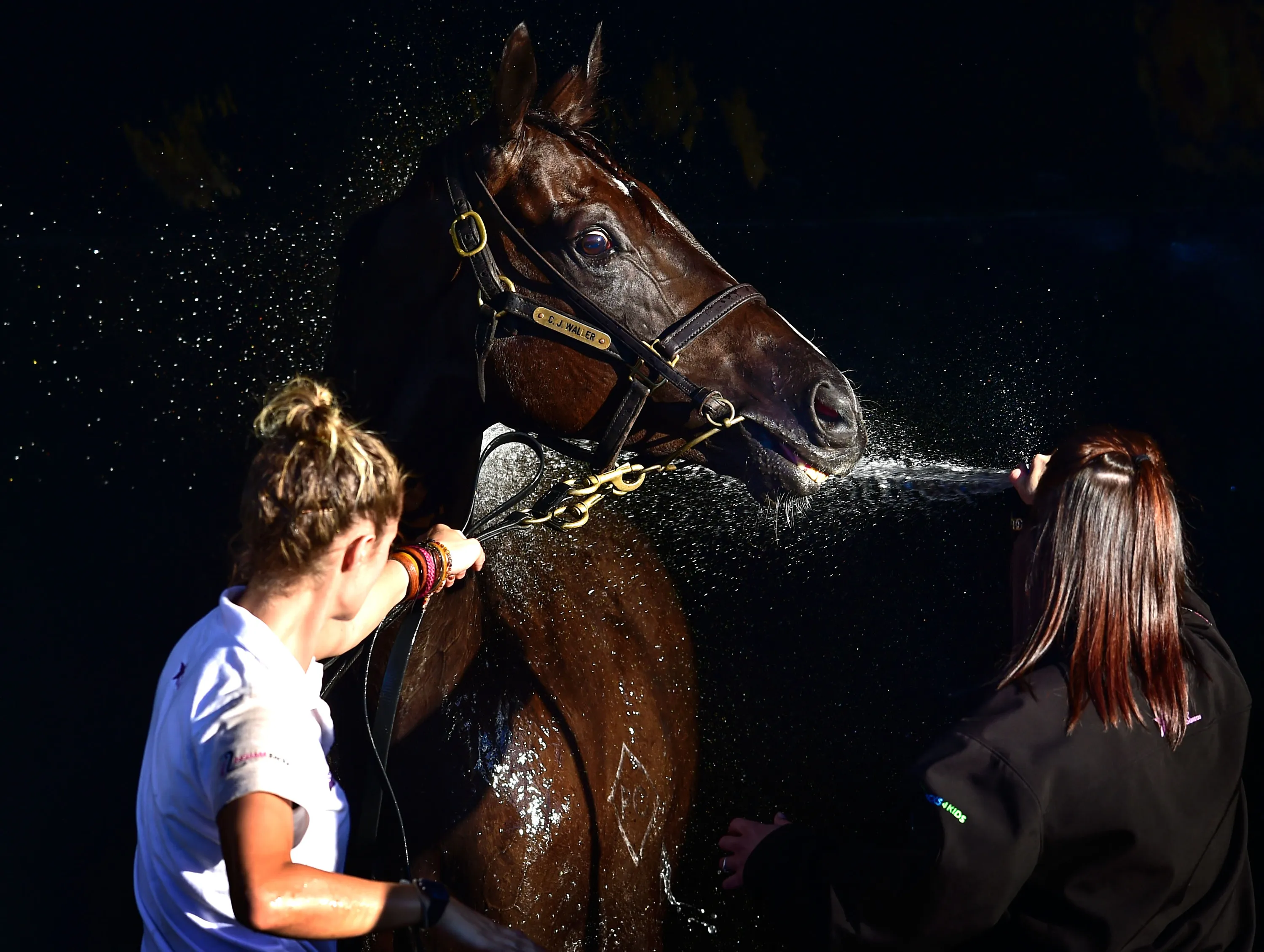 Black Revolver from the Chris Waller stable is washed down during Melbourne Racing at Mornington Racecourse on March 28, 2015 in Melbourne, Australia. (Photo by Vince Caligiuri/Getty Images)