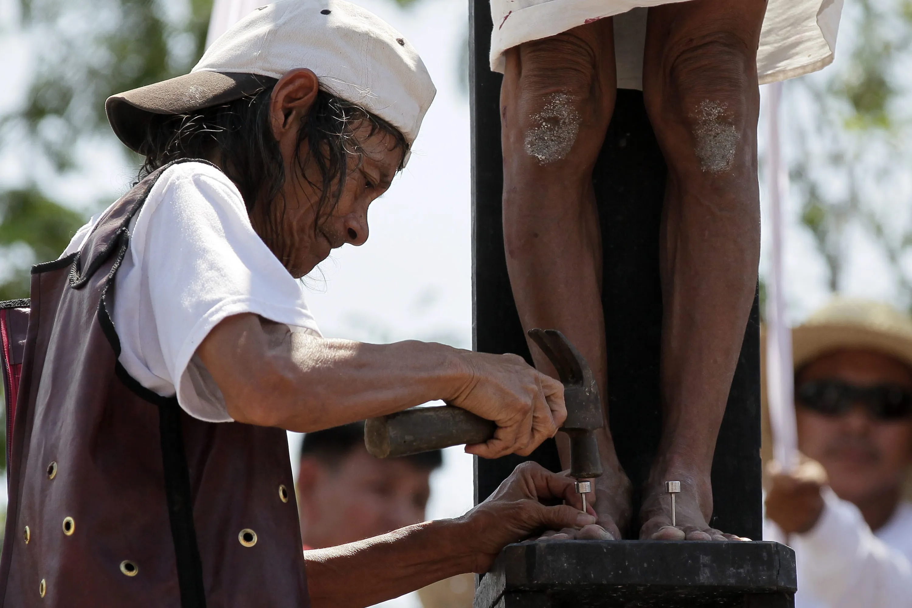 The foot of a Filipino penitent is nailed to a wooden cross during the re-enactment of the crucifixion of Jesus Christ on Good Friday, in San Juan village, San Fernando city, north of Manila, Philippines, 03 April 2015. Every year, thousands of foreign and local visitors flock to San Pedro Cutud village, San Fernando city, to watch hooded and barefoot penitents lash their backs bloody along a narrow road that leads to a dusty hillock, where other men dressed as Jesus Christ are nailed to wooden crosses. (Photo by Ritchie B. Tongo/EPA)