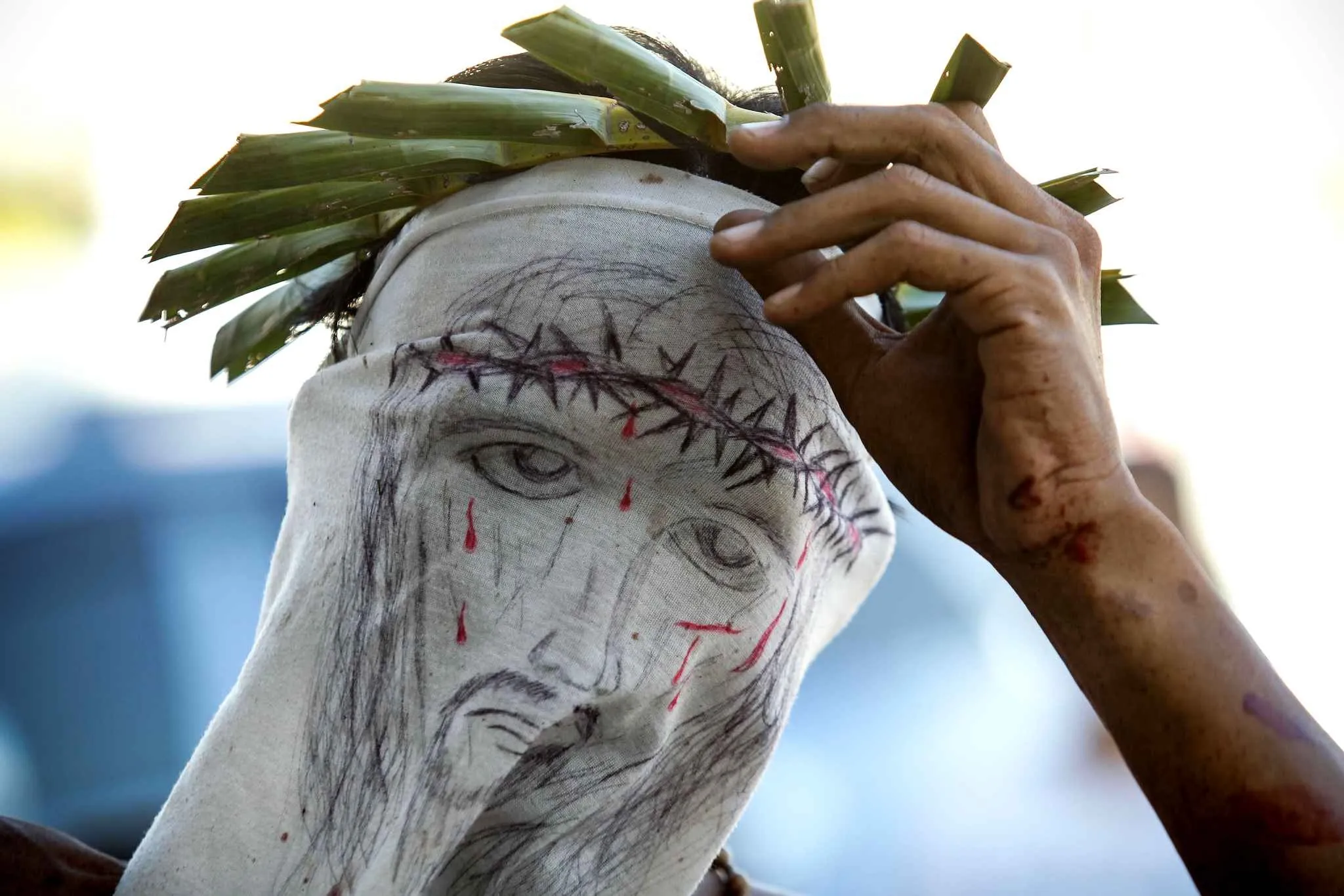 A penitent removes his crown in San Fernando, Pampanga on Maundy Thursday, April 2, 2015. Every year during Holy Week hundreds of penitents perform acts of penance such as self-flagellation, walking barefoot, carrying a cross and self-crucifixion throughout the Philippines, a pre-dominantly Catholic country. (Photo by Mark Cristino/Pacific Press)