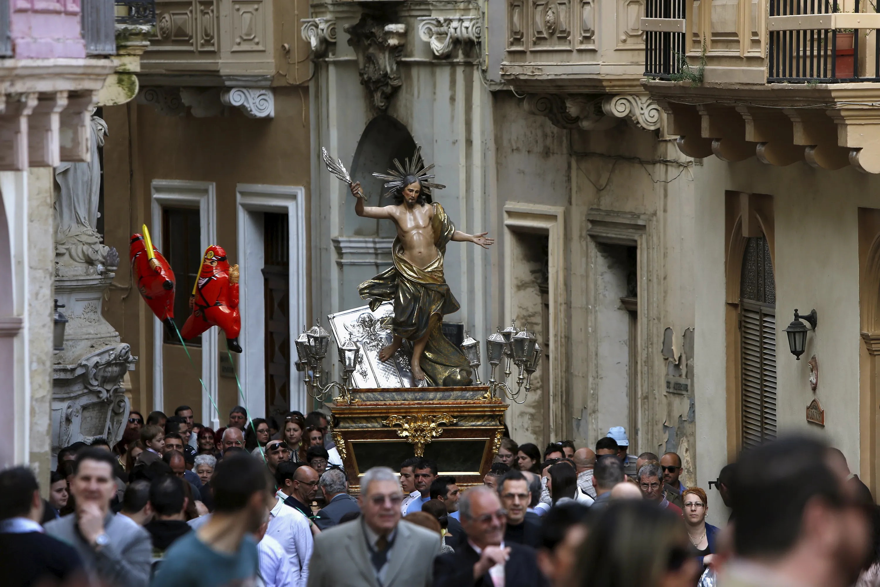A statue of the Risen Christ is carried during an Easter Sunday procession in Cospicua, outside Valletta, Malta April 5, 2015. (Photo by Darrin Zammit Lupi/Reuters)