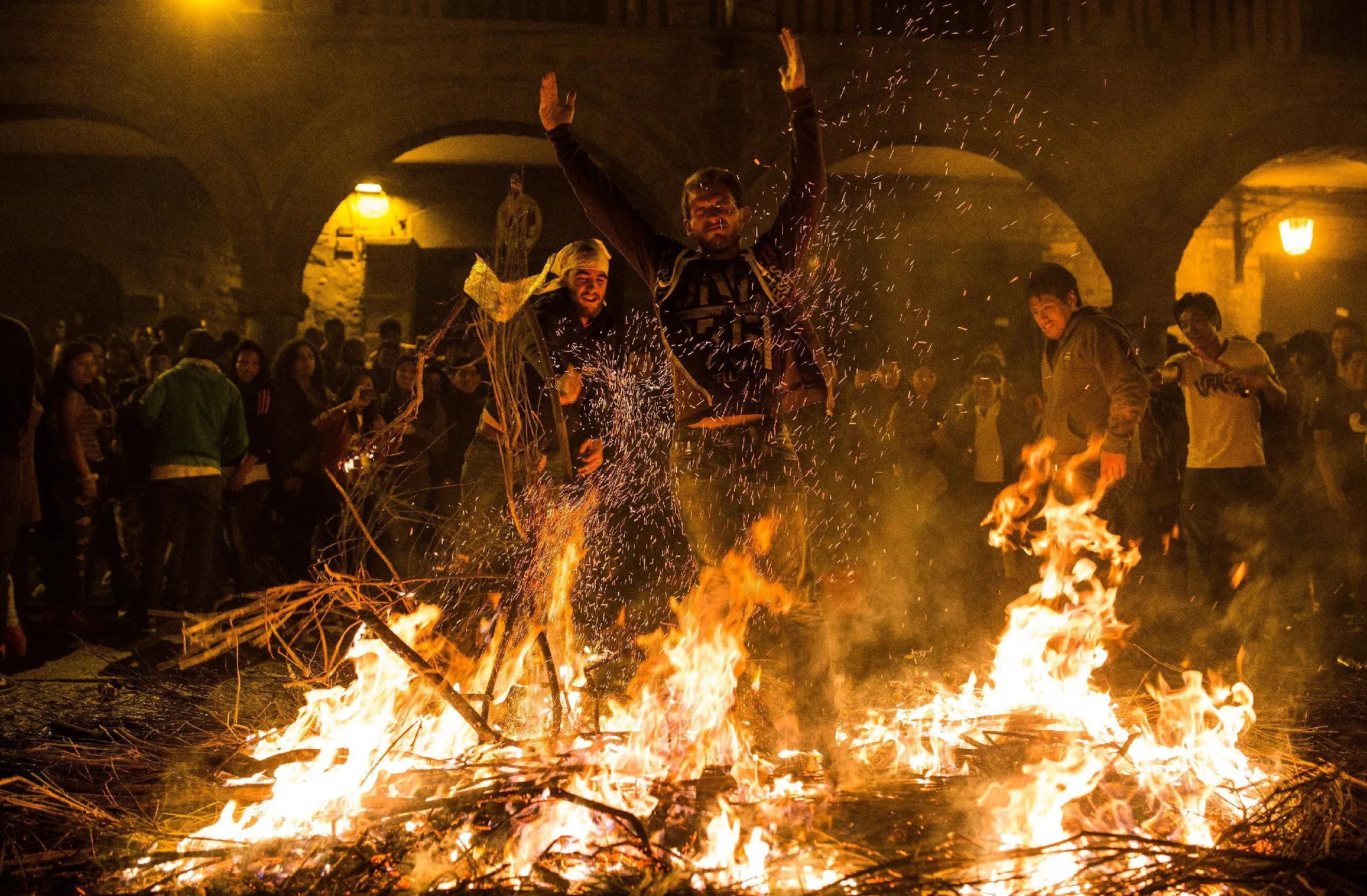 Parishioners jump over bonfires as they wait for the start of a procession during the Holy Week celebrations in Ayacucho, Peru, Sunday, April 5, 2015. Ayacucho has large religious celebrations during the Holy Week. These celebrations also include processions, fireworks, horse races and the a running of the bulls. (Photo by Sebastian Castañeda/AP Photo)