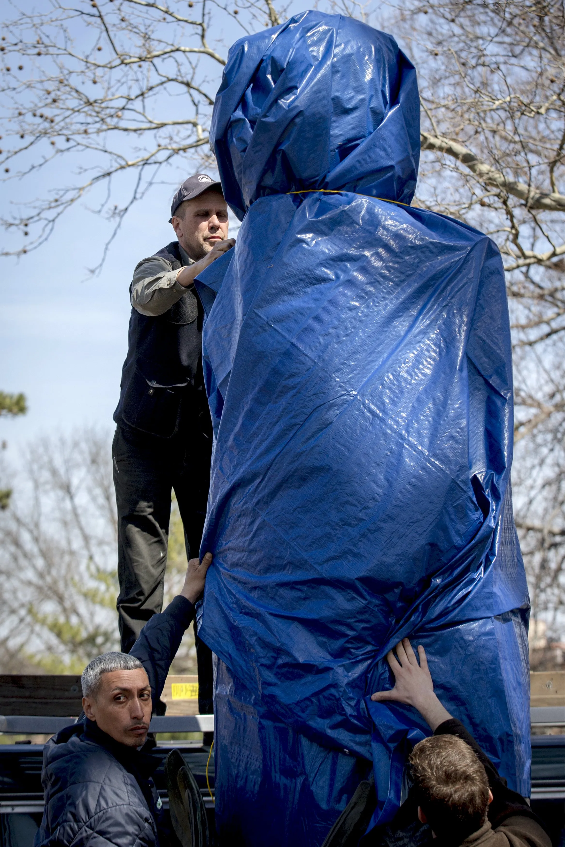 New York City Parks workers work to remove a large molded bust of Edward Snowden at Fort Greene Park in the Brooklyn borough of New York April 6, 2015. (Photo by Brendan McDermid/Reuters)
