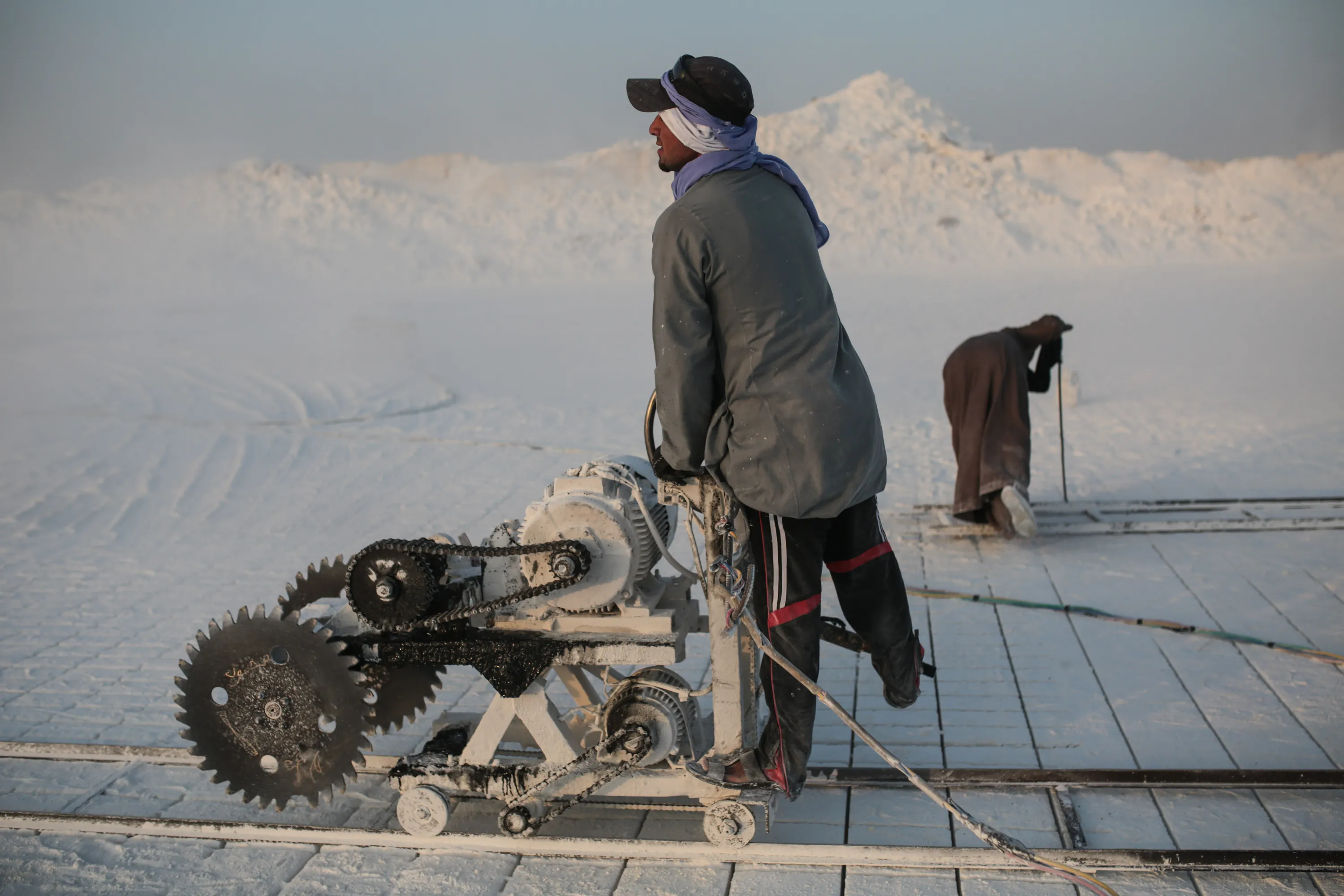 In this Wednesday, March 18, 2015 photo, a quarry worker uses a machine with sharp rotor blades to cut through limestone pits at a quarry in the desert of Minya, southern Egypt. (Photo by Mosa'ab Elshamy/AP Photo)