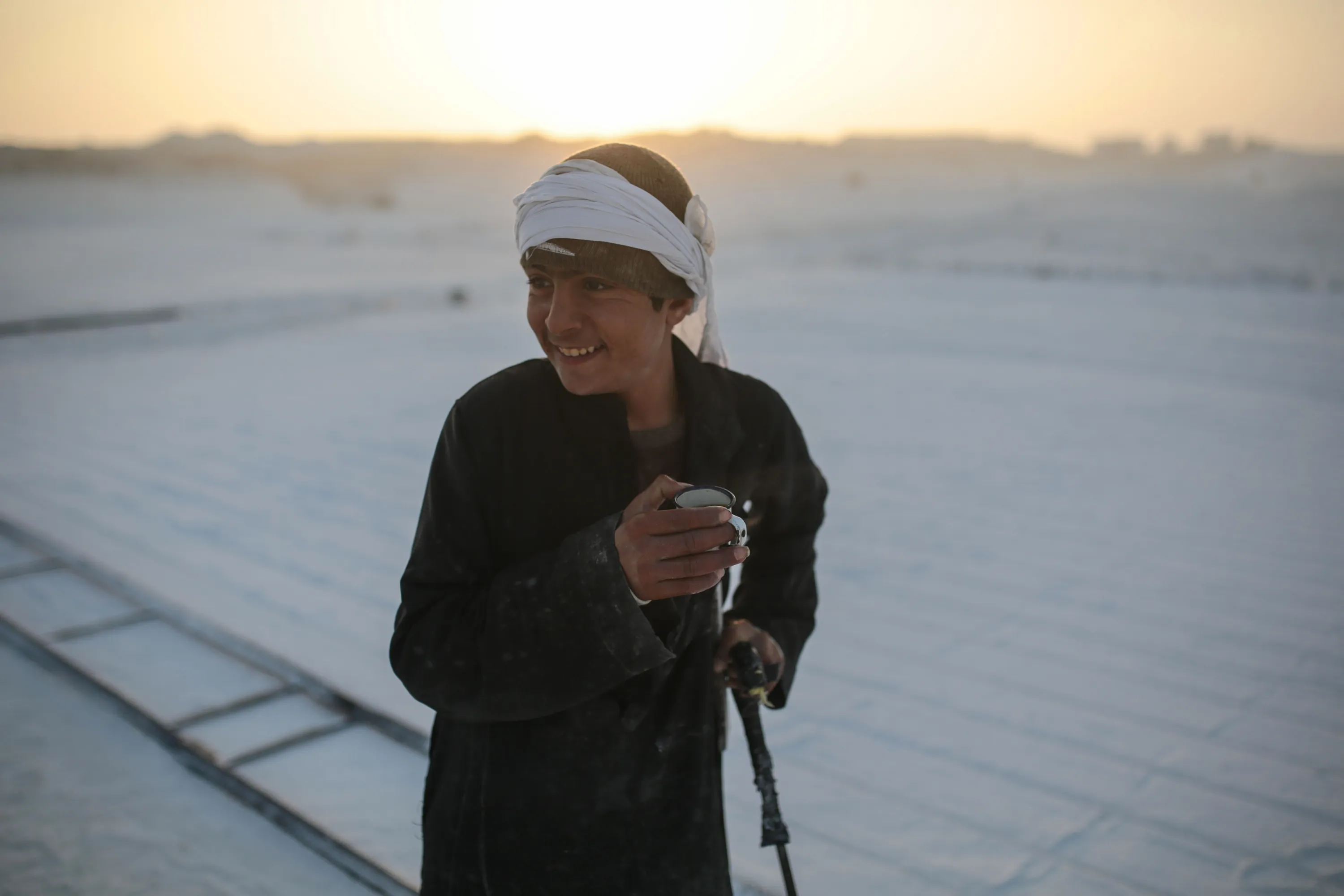 In this Wednesday, March 18, 2015 photo, a young worker smiles during a tea break at sunrise in the desert of Minya, southern Egypt. Some children as young as 10 years old work in the quarries to help their families, risking injury and sometimes death. (Photo by Mosa'ab Elshamy/AP Photo)