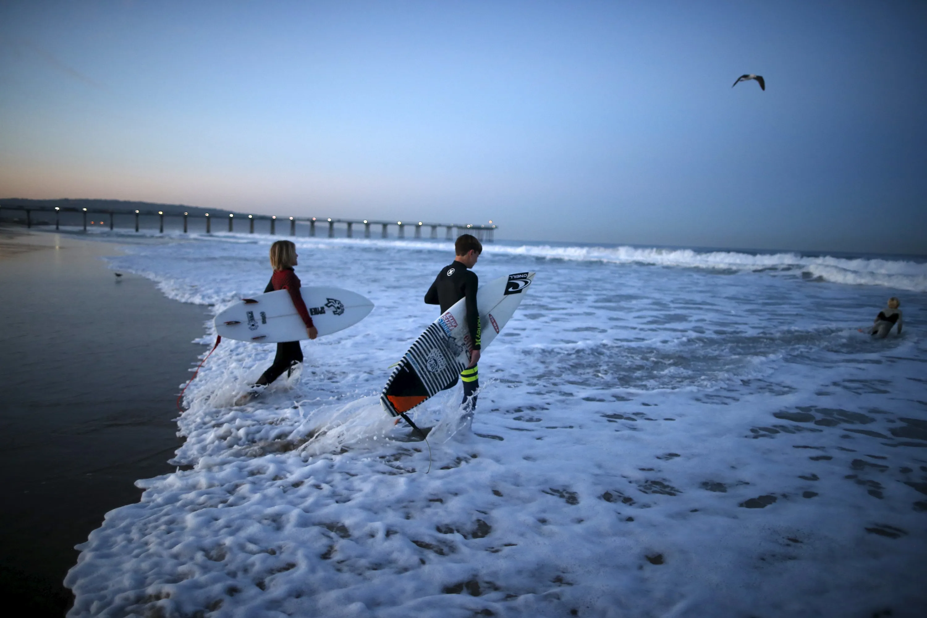 Luke Personius, 12, (R) and Shane Moseley, 13, go surfing before school at sunrise in Hermosa Beach, California March 24, 2015. (Photo by Lucy Nicholson/Reuters)