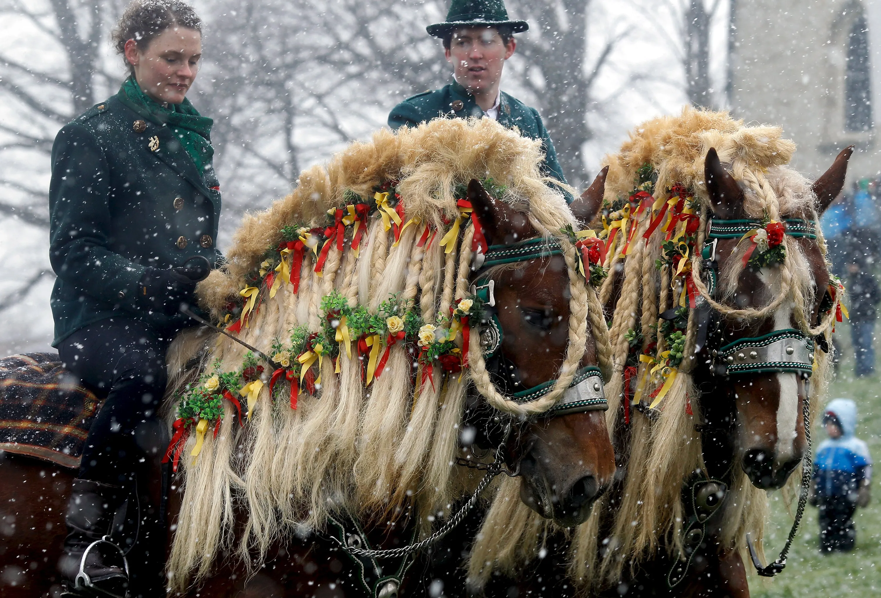 Pilgrims dressed in traditional Bavarian clothes attend the traditional Georgi horse riding procession on Easter Monday in heavy snowfall, in the southern Bavarian town of Traunstein April 6, 2015. Since the early 16th century, farmers have taken part in the pilgrimage to bless their horses. This tradition, the “Georgiritt”, goes back to the legend of Saint George, the horsemen's patron saint. (Photo by Michael Dalder/Reuters)