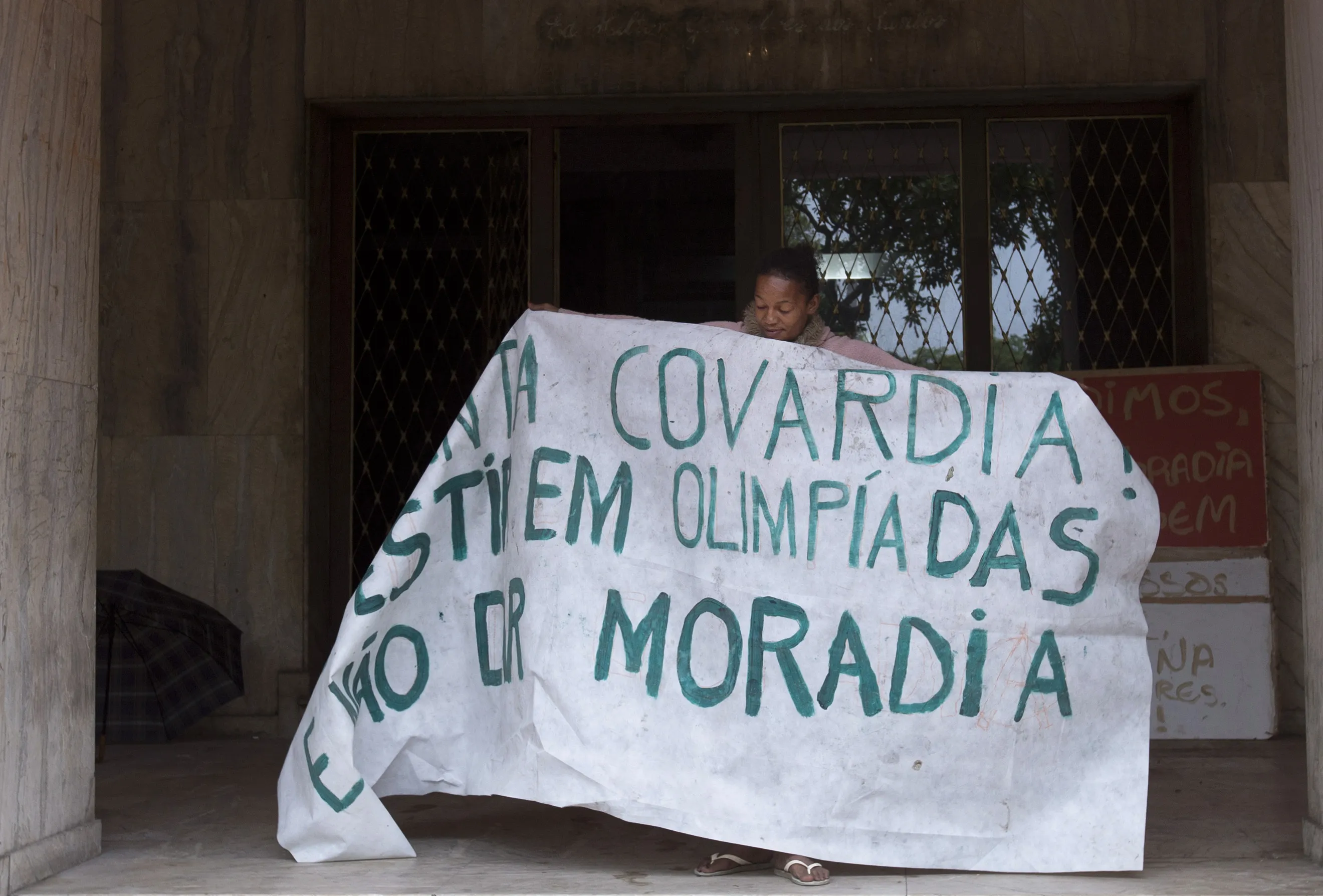 A woman holds open a banner that reads in Portuguese “Such cowardice. Investment in Olympics and not housing” to show it to the press and neighbors from inside an abandoned building in the middle class Flamengo neighborhood of Rio de Janeiro, Brazil, Tuesday, April 7, 2015. (Photo by Silvia Izquierdo/AP Photo)