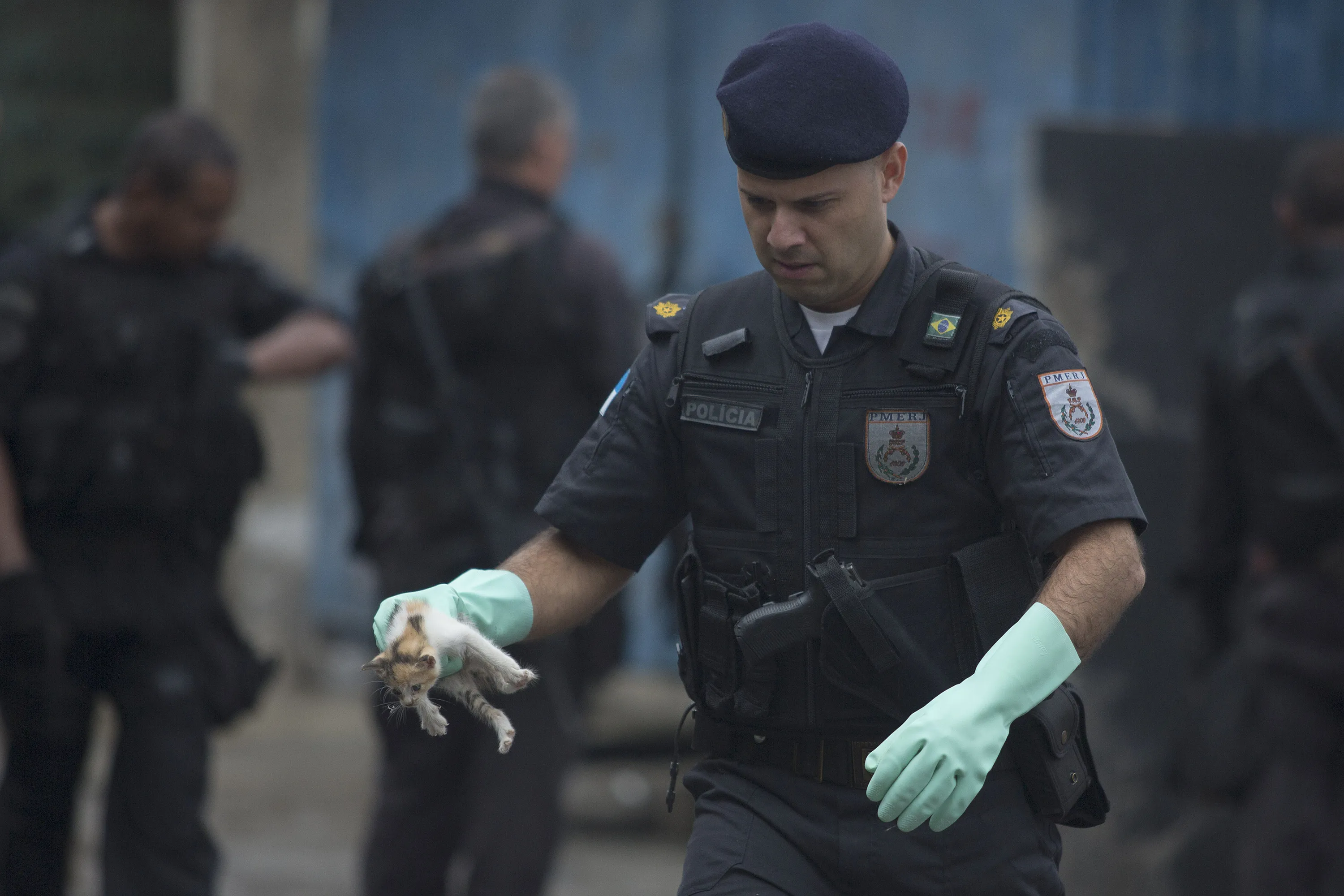 A police officer carries a kitten that was found in an area where the police is building a checkpoint in the Alemao slum complex as part of a security reinforcement by the UPP (Police Pacification Unit) in Rio de Janeiro, Brazil, Tuesday, April 7, 2015. The kitten was found with several others and the litter was taken to a store close by to be taken care of. (Photo by Leo Correa/AP Photo)