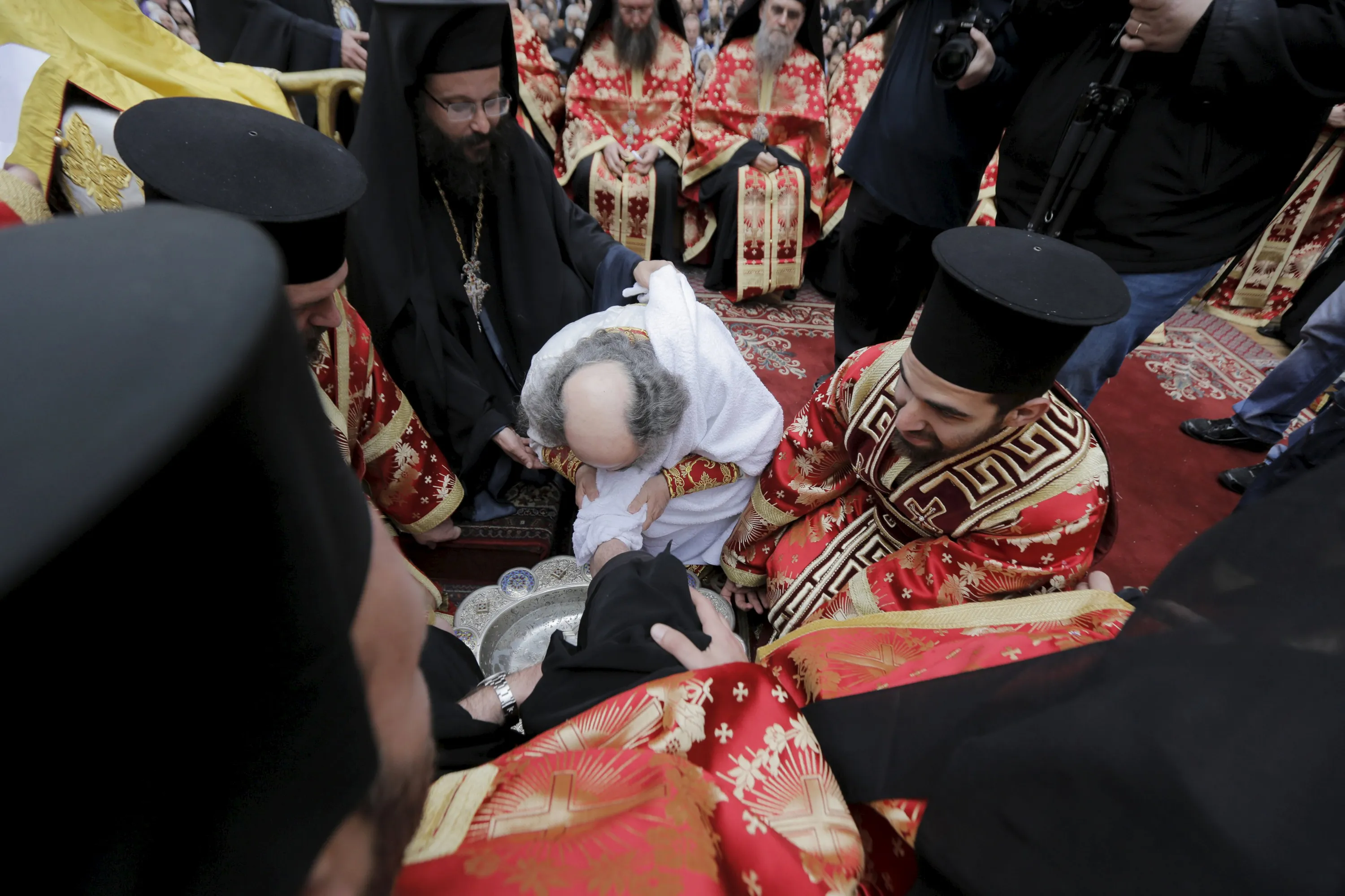 Greek Orthodox Patriarch of Jerusalem Metropolitan Theophilos (C) washes the foot of a priest during the washing of the feet ceremony outside the Church of the Holy Sepulchre in Jerusalem's Old City, April 9, 2015, ahead of Orthodox Easter. (Photo by Ammar Awad/Reuters)