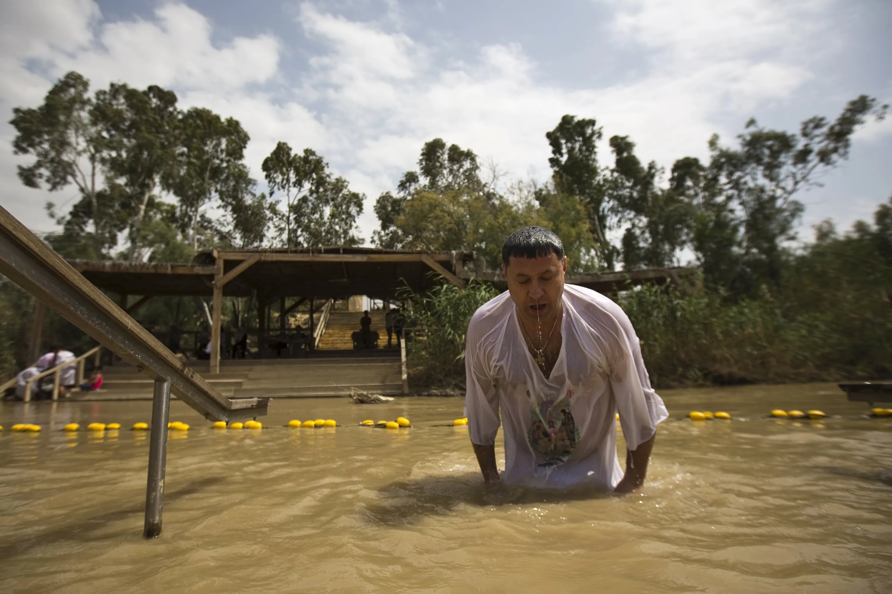 A Christian pilgrim dips in the water during his visit to the baptismal site known as Qasr el-Yahud on the banks of the Jordan River near the West Bank city of Jericho April 9, 2015. (Photo by Amir Cohen/Reuters)