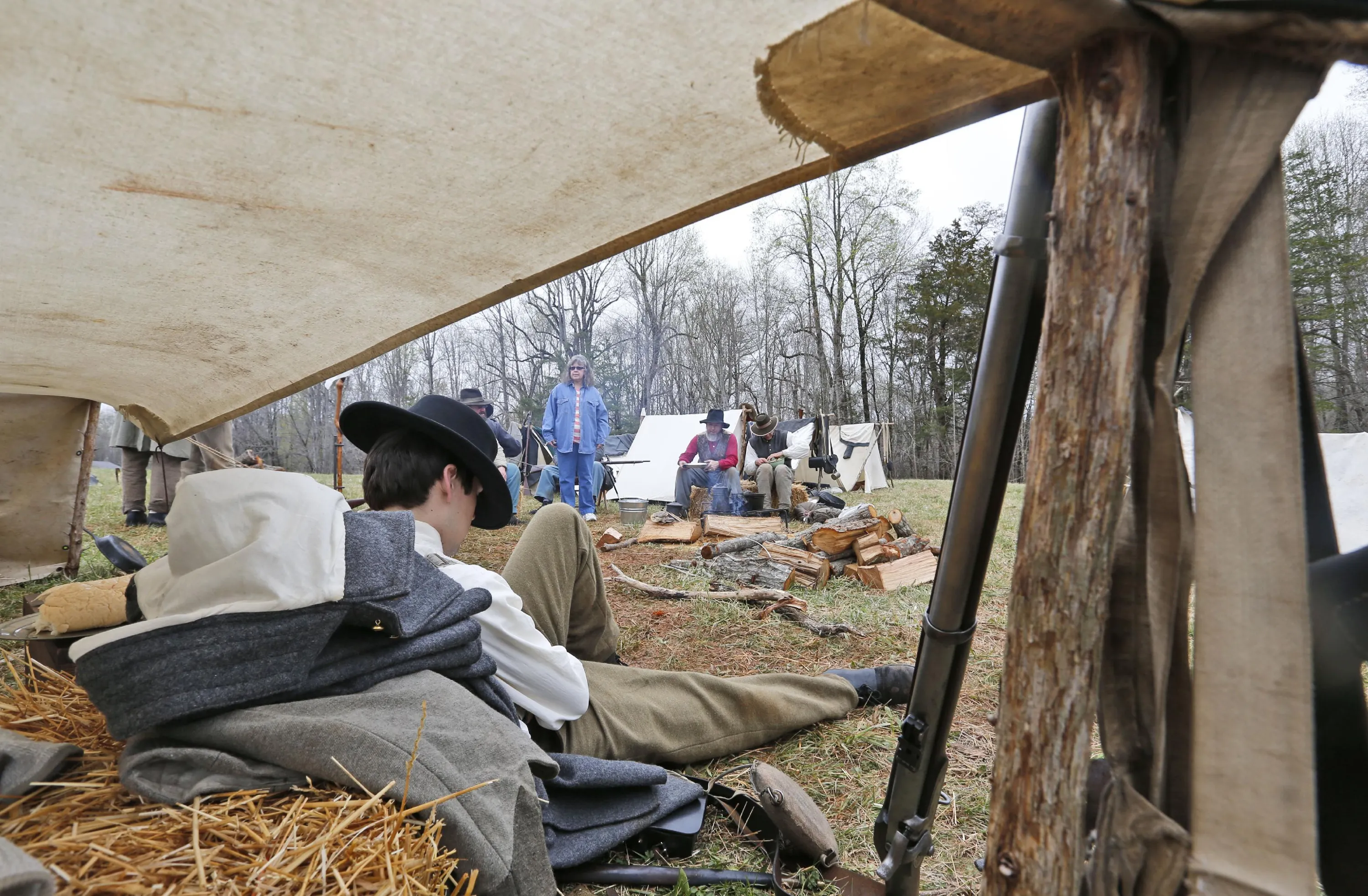 Confederate re-enactors take a break in their camp as part of the commemoration of the 150th anniversary of the surrender of the Army of Northern Virginia at Appomattox Court House in Appomattox, Va., Thursday, April 9, 2015. (Photo by Steve Helber/AP Photo)