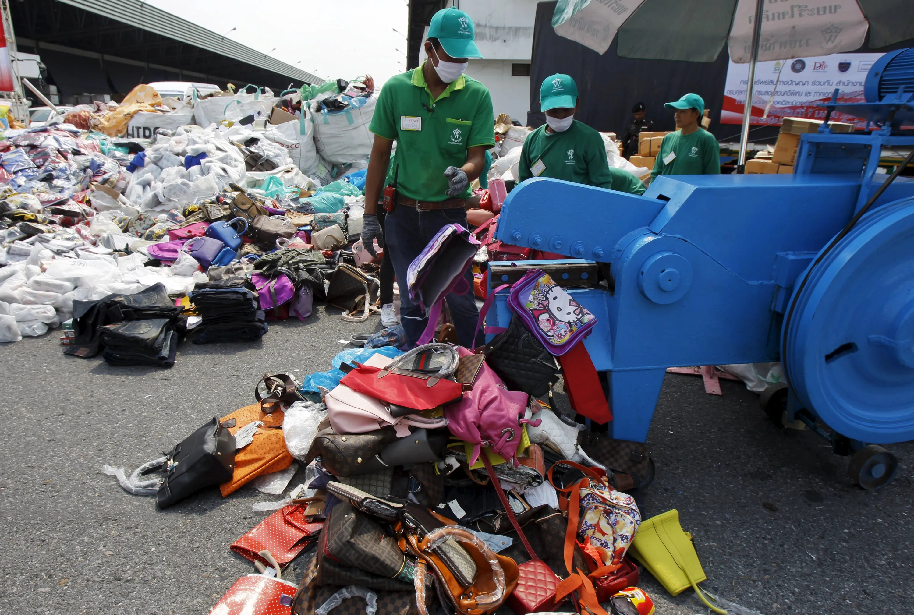 Thai Department of Intellectual Property and police officials destroy counterfeit goods at Khlongluang Transportation Station in Pathumtani province, on the outskirts of Bangkok April 9, 2015. The counterfeit goods, which included piles of CDs, DVDs, handbags, clothes, brand name shoes, cell phones, caps, glasses, computers, cosmetics and watches are worth over 3.7 billion Thai baht ($ 115,790,901), according to local authorities. (Photo by Chaiwat Subprasom/Reuters)