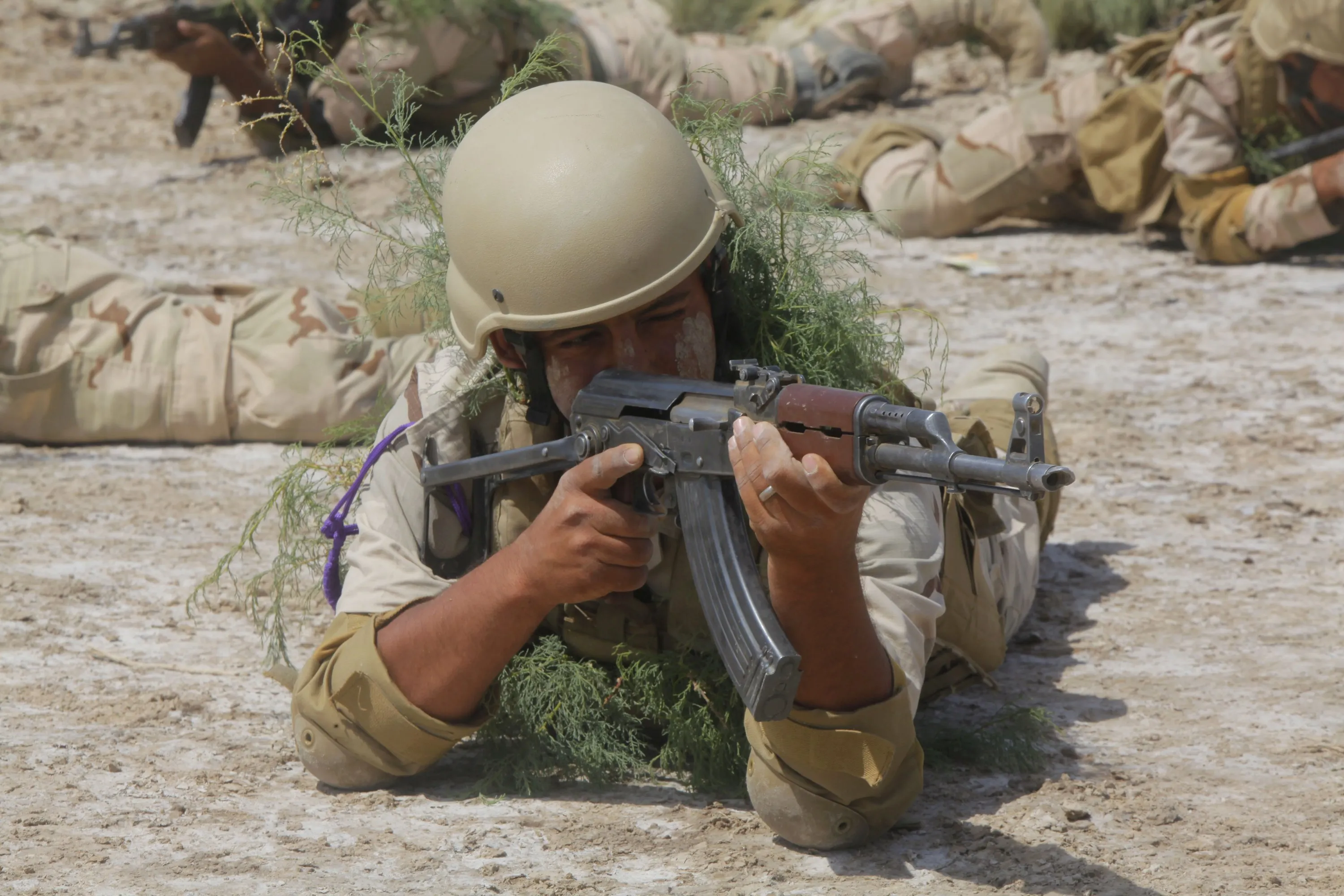 A member from the Iraqi security forces carries his weapon during military training in Jurf al-Sakhar, Iraq April 9, 2015. (Photo by Alaa Al-Marjani/Reuters)