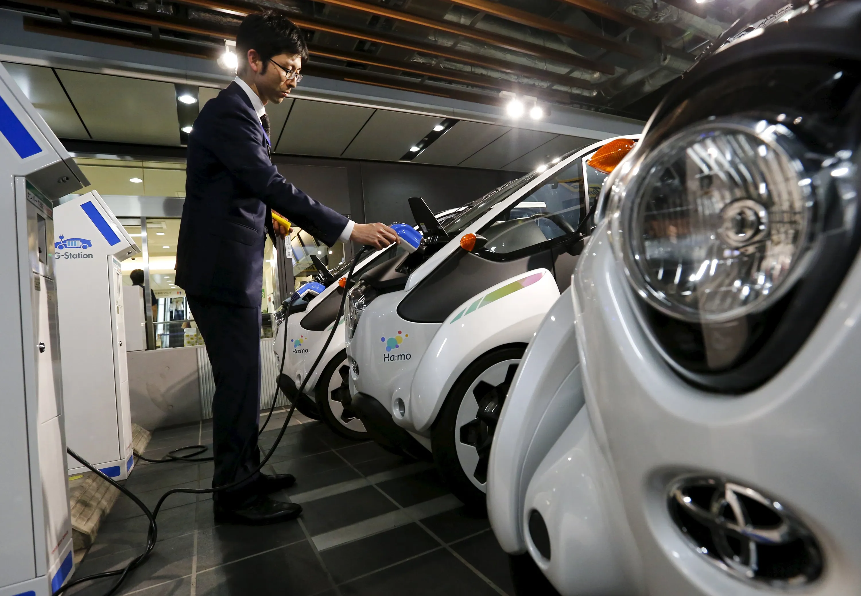 A staff member plugs a charger cable into Toyota's i-Road electric vehicle in Tokyo April 9, 2015. (Photo by Thomas Peter/Reuters)