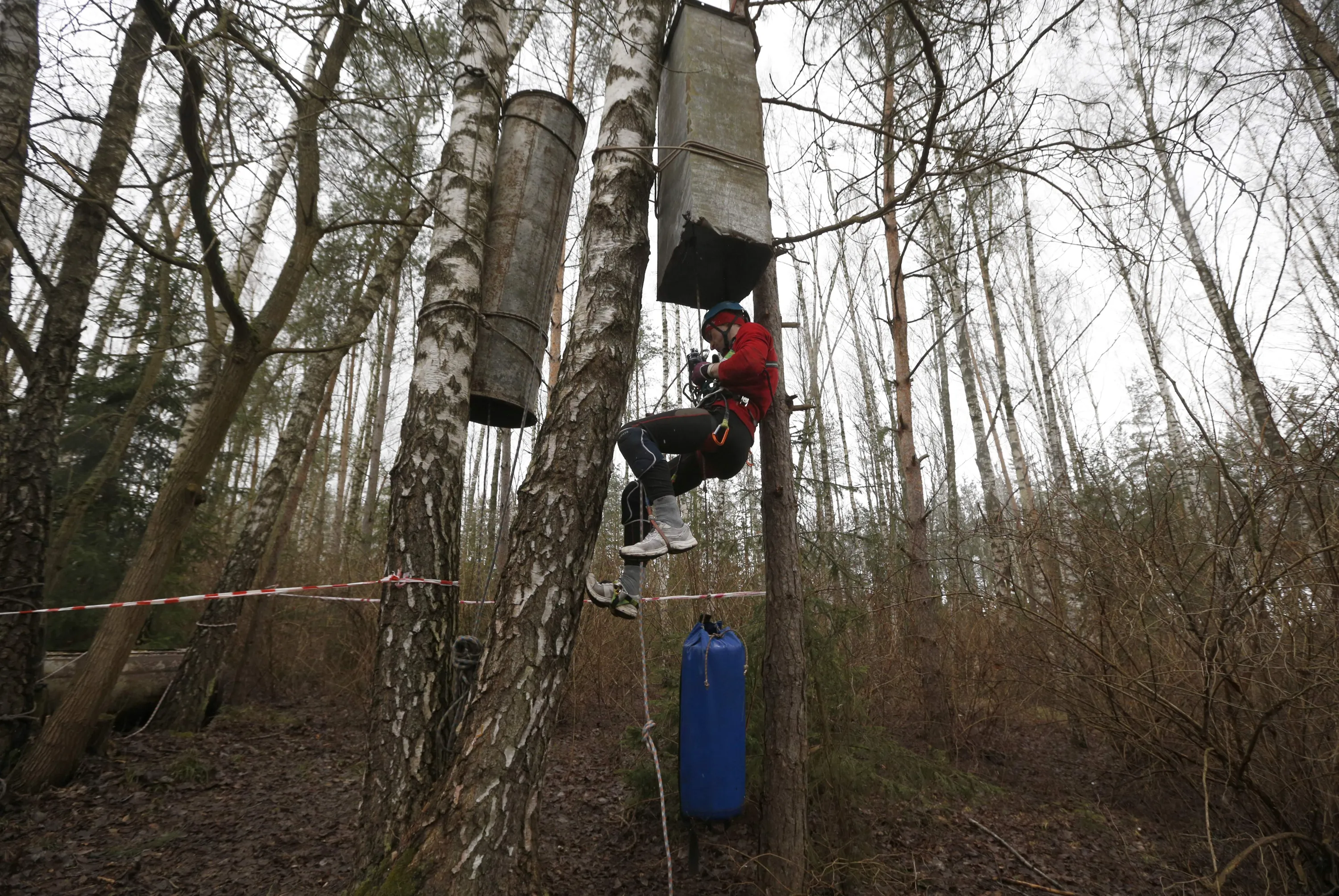 Belarusian cave explorer takes part in an competition of speleologists in the forest near village of Raubichi, on the outskirts of Minsk, Belarus, Saturday, April 4, 2015. These competitions are held each year to improve and demonstrate the skills needed for the study of caves. (Photo by Sergei Grits/AP Photo)