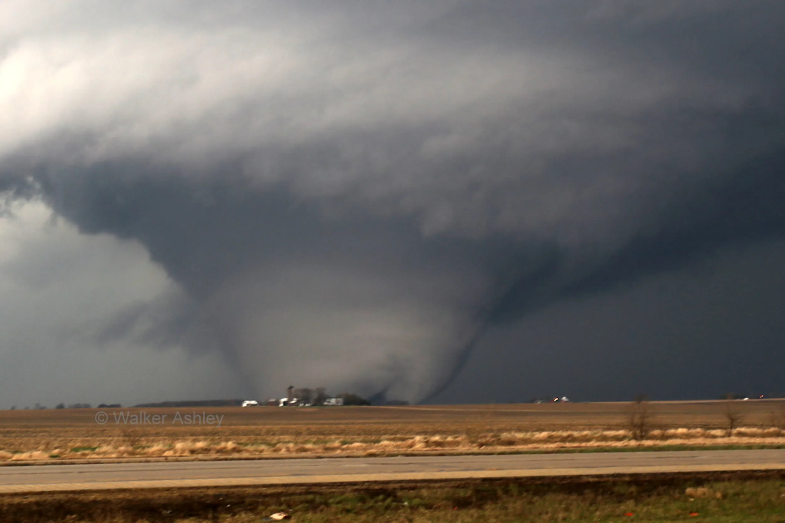 In this Thursday, April 9, 2015 photo provided by Northern Illinois University meteorology professor Walker Ashley, a funnel cloud moves through near Rochelle, Ill. The National Weather Service says at least two tornadoes churned through six north-central Illinois counties on Thursday evening. (Photo by Walker Ashley/AP Photo)