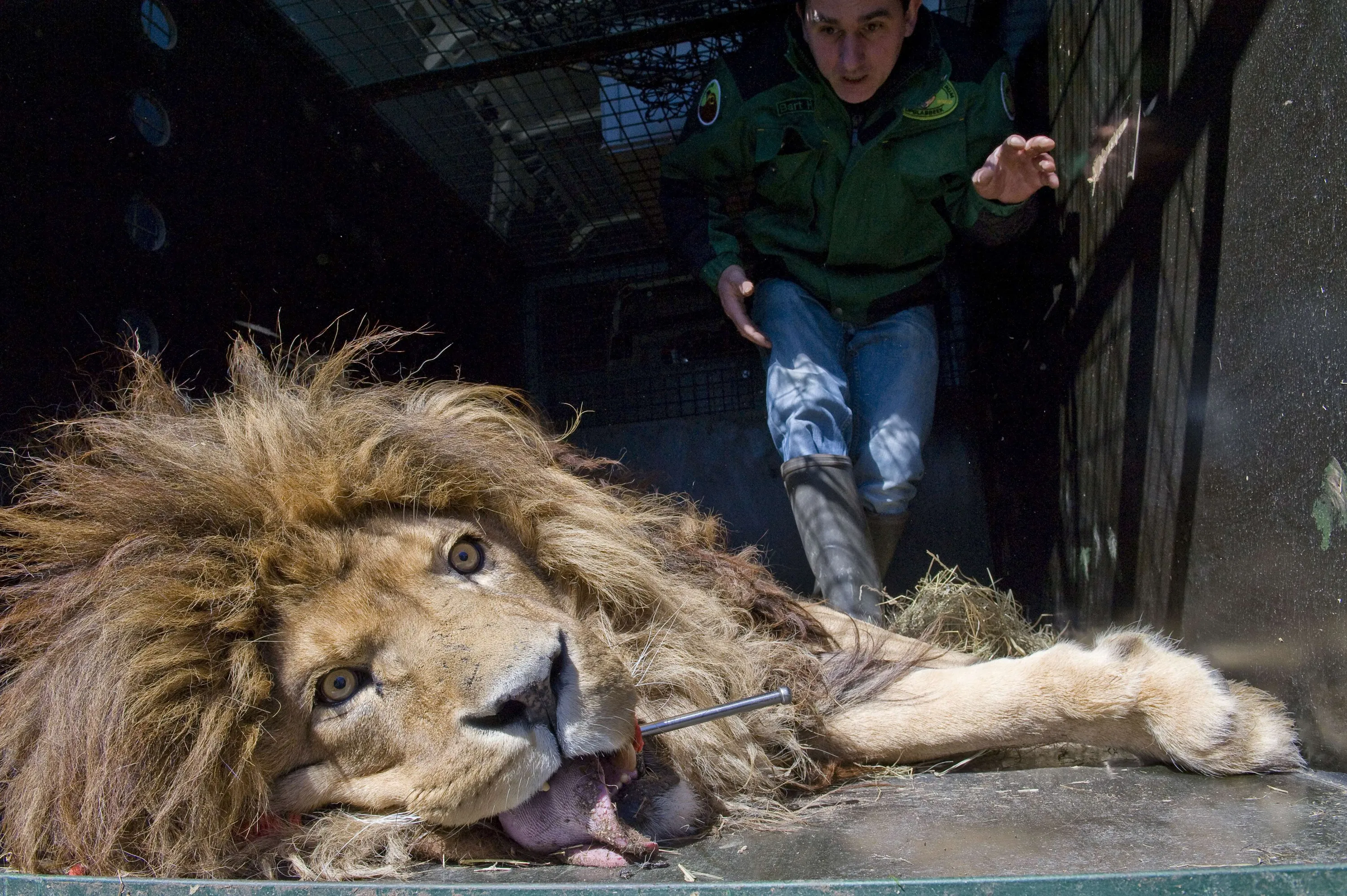 A man stands next to a lion which was anaesthetized in a truck in Champetieres during the evacuation of over 160 animals from the Bouy zoo which is in compulsory liquidation and whose owner was jailed for international trafficking of protected species by an organized gang, on April 9, 2015. (Photo by Thierry Zoccolan/AFP Photo)ZOCCOLANTHIERRY ZOCCOLAN/AFP/Getty Images