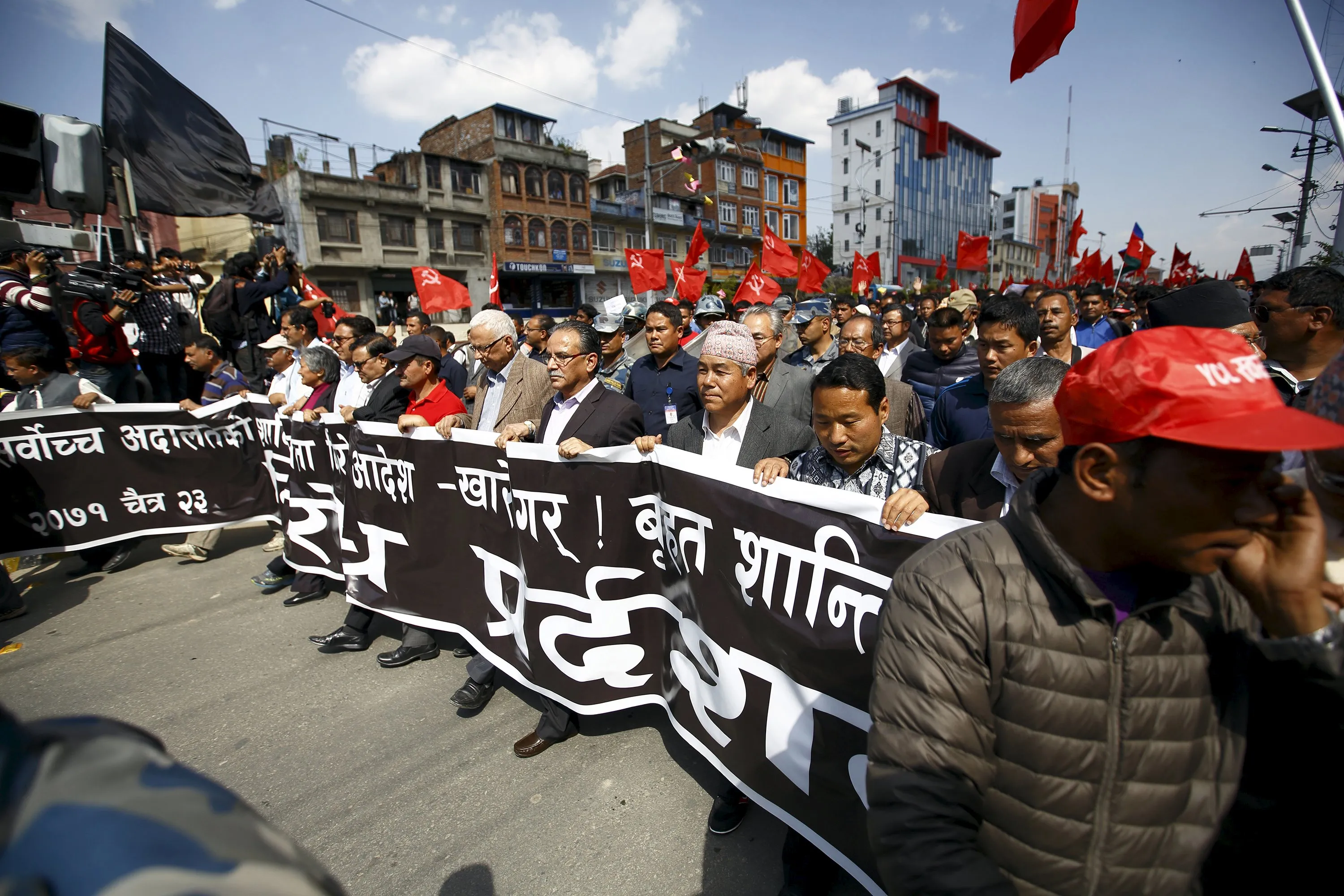 Chairman of the Unified Communist Party of Nepal (Maoist) Pushpa Kamal Dahal, also known as Prachanda, (C) along with senior leaders of various Maoist parties, takes part in a protest rally in Kathmandu April 6, 2015. According to the local media reports, Maoist parties took out a rally against the Supreme Court verdict that disallowed providing mass amnesty to those facing accusations for crimes during civil war. Almost a decade has passed since the end of a civil war that pitted Maoist guerillas against the state and killed more than 17,000 people. Nepal's political parties have repeatedly missed deadlines to write the new republic's first constitution. At the heart of the dispute is disagreement over creating new provinces based on ethnicity, a move backed by the former rebels. (Photo by Navesh Chitrakar/Reuters)