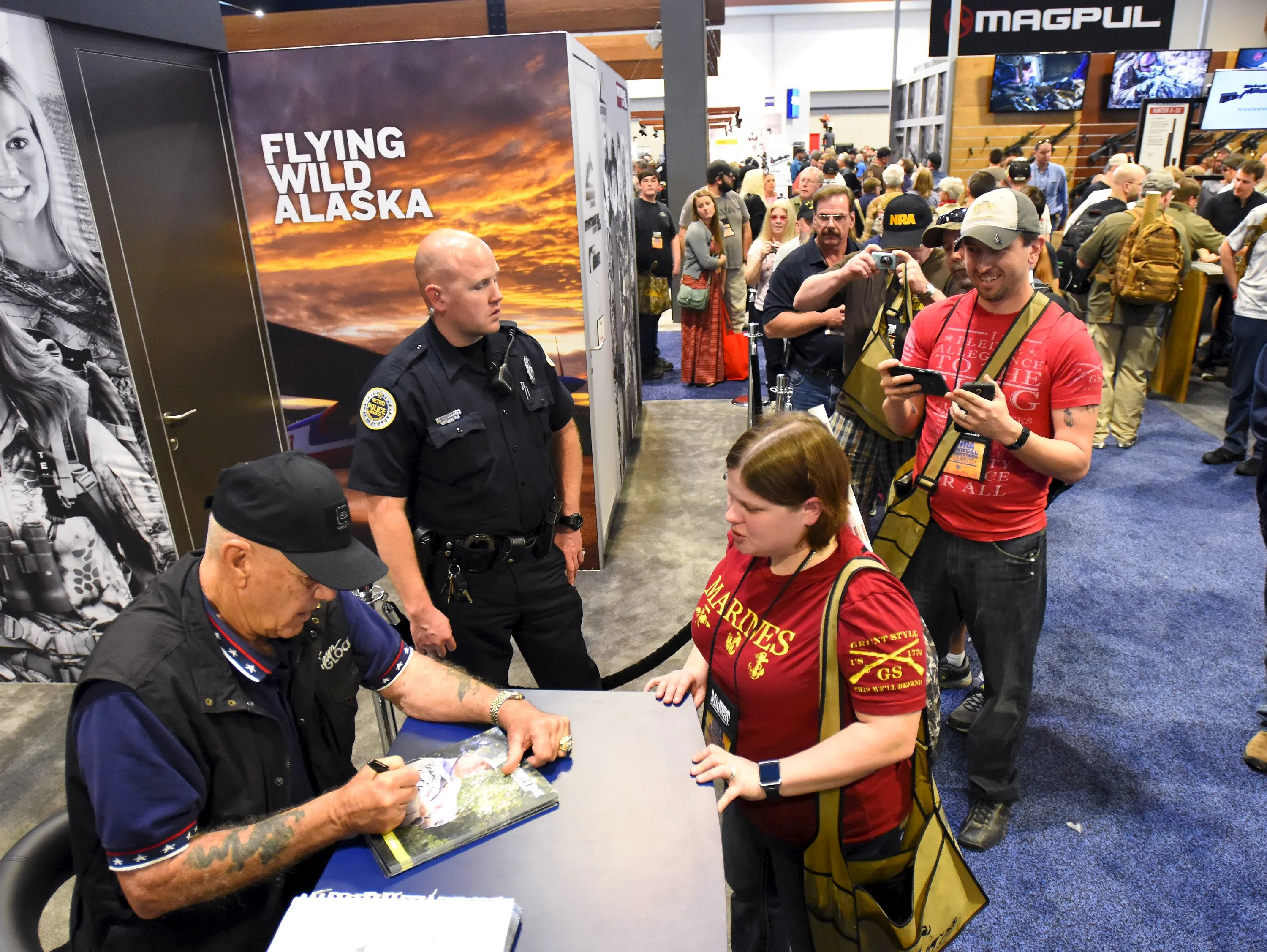 Virginia Bass gets an autograph from actor and former Marine Gunnery Sergeant R Lee Ermey in the trade booths during the National Rifle Association's annual meeting in Nashville, Tennessee, April 11, 2015. (Photo by Harrison McClary/Reuters)