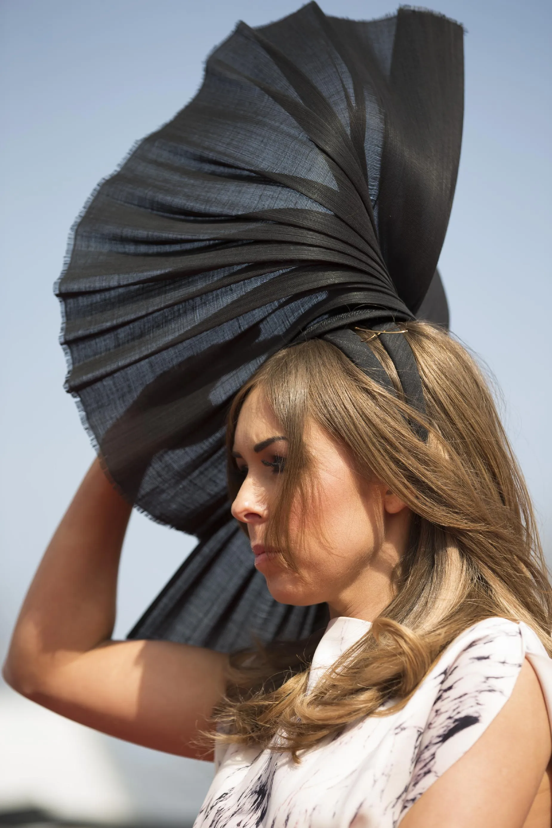 A spectator holds her hat on in the breeze during Aintree race meeting's Ladies Day the day before the Grand National horse race at Aintree Racecourse Liverpool, England, Friday, April 10, 2015. (Photo by Jon Super/AP Photo)