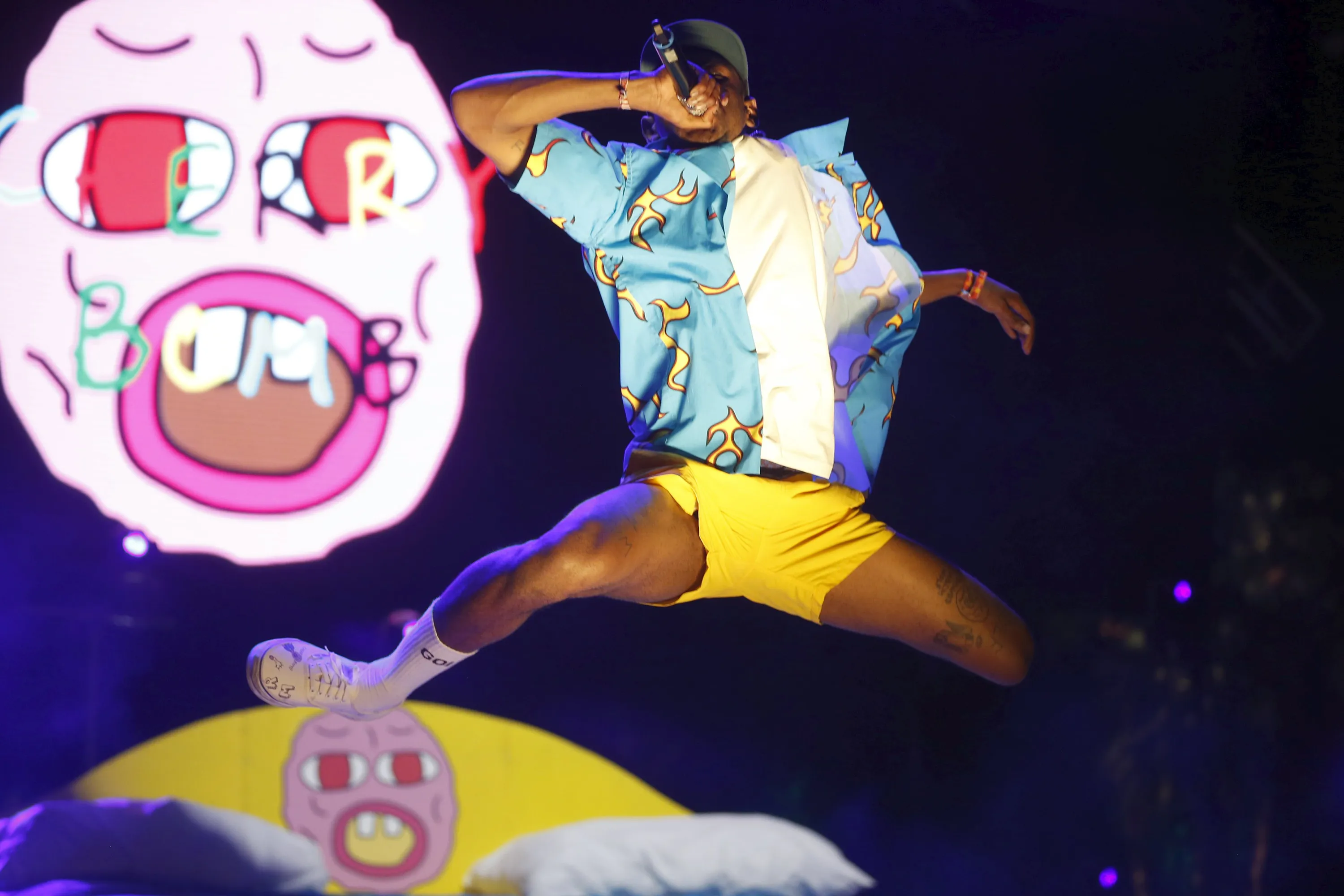 Tyler the Creator jumps off a stage set giant bed at the Coachella Valley Music and Arts Festival in Indio, California April 11, 2015. (Photo by Lucy Nicholson/Reuters)
