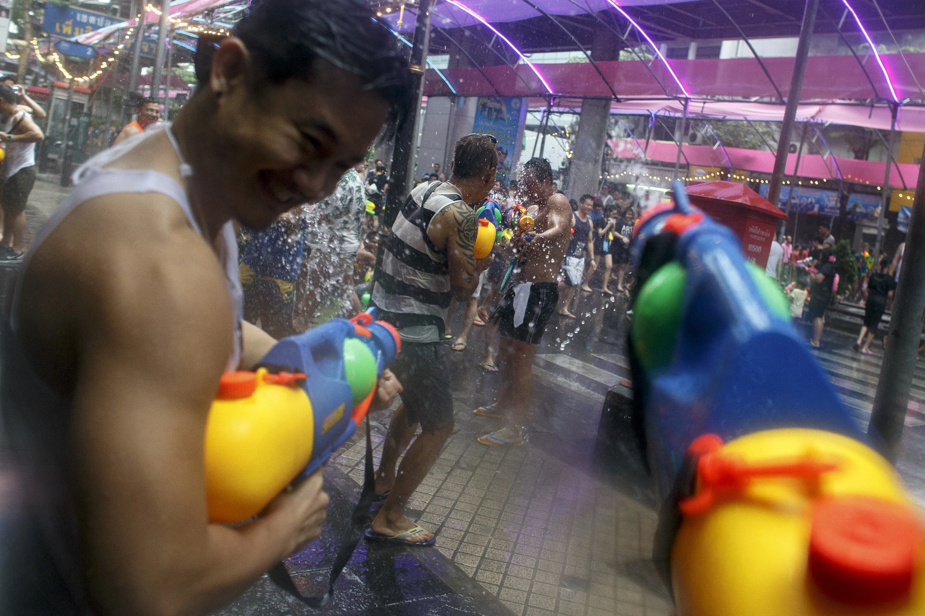 Revelers use water guns as they participate in a water fight during Songkran Festival celebrations at Silom road in Bangkok April 12, 2015. (Photo by Athit Perawongmetha/Reuters)