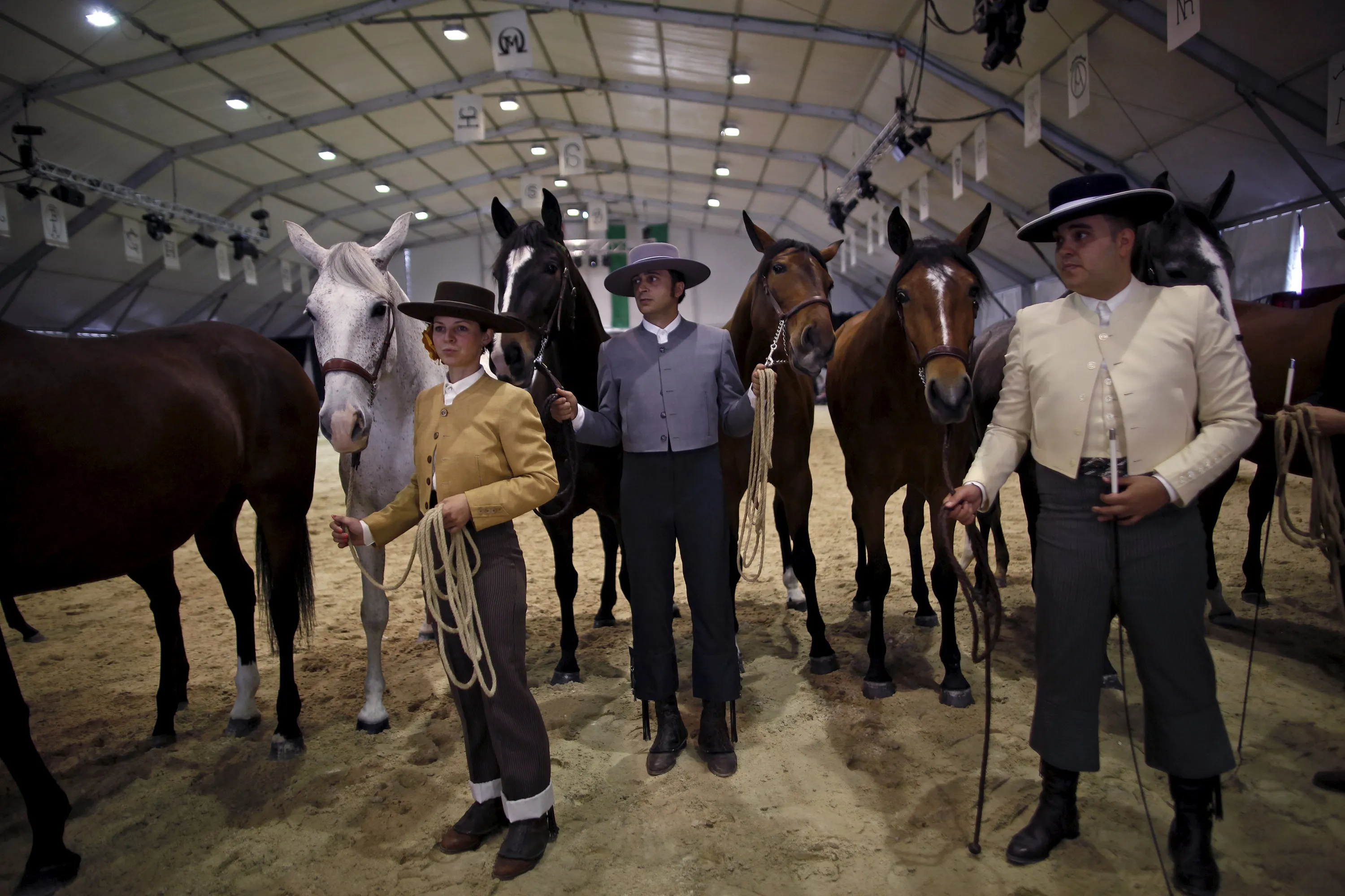 Andalusian riders wait for trophies at the arena with their Spanish thoroughbred horses after a form contest during the Sacab Andalusian Horse Show in Coin, southern Spain, April 12, 2015. (Photo by Jon Nazca/Reuters)