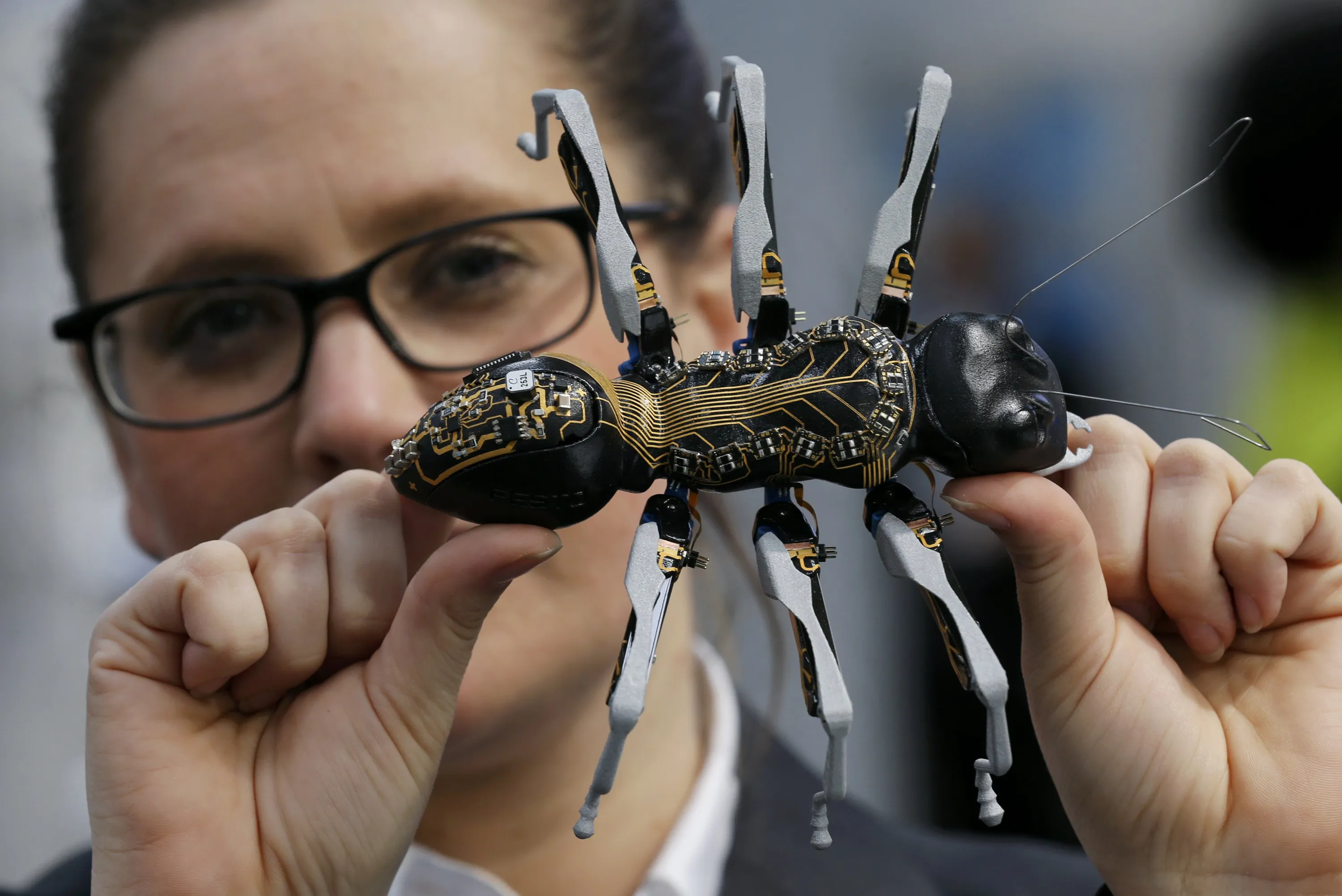 A woman holds a BionicANT (according to manufacturer, “ANT” stands both for the natural role model and for Autonomous Networking Technologies) developed by German FESTO company, at the world's largest industrial technology fair, the Hannover Messe in Hanover, April 12, 2015. (Photo by Wolfgang Rattay/Reuters)