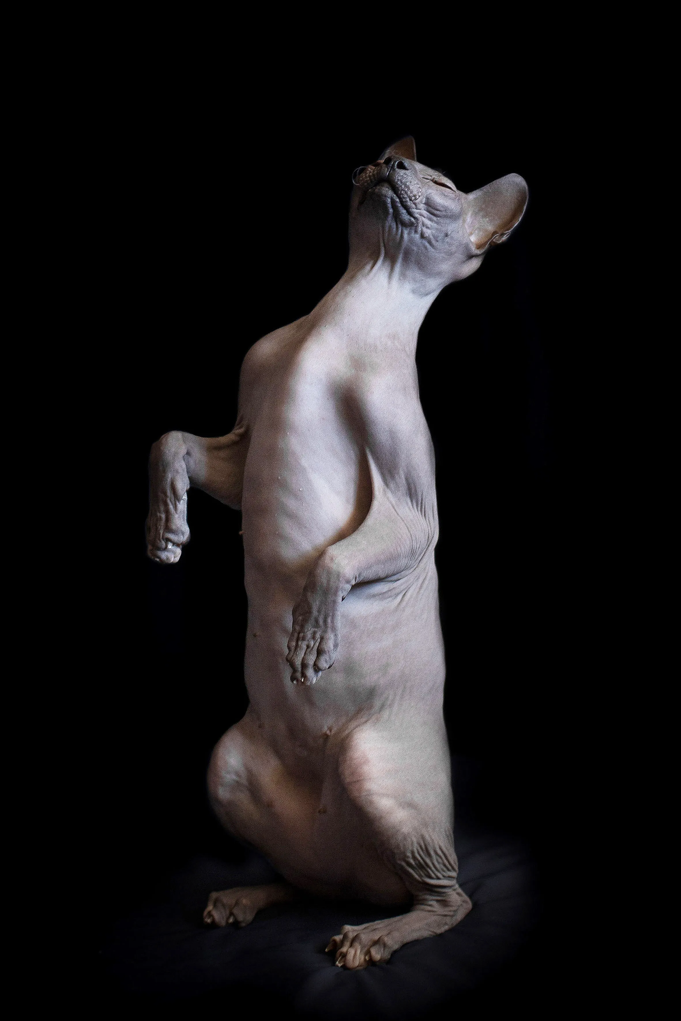 A photographer has captured the bizarre beauty of sphynx cats in a series of intriguing portraits. Creative Alicia Rius snapped them from different angles showing off their unusual flesh, colourings and bones. In the images the cats can be seen curiously playing, observing their surroundings and even grooming themselves. (Photo by Alicia Rius/Caters News)