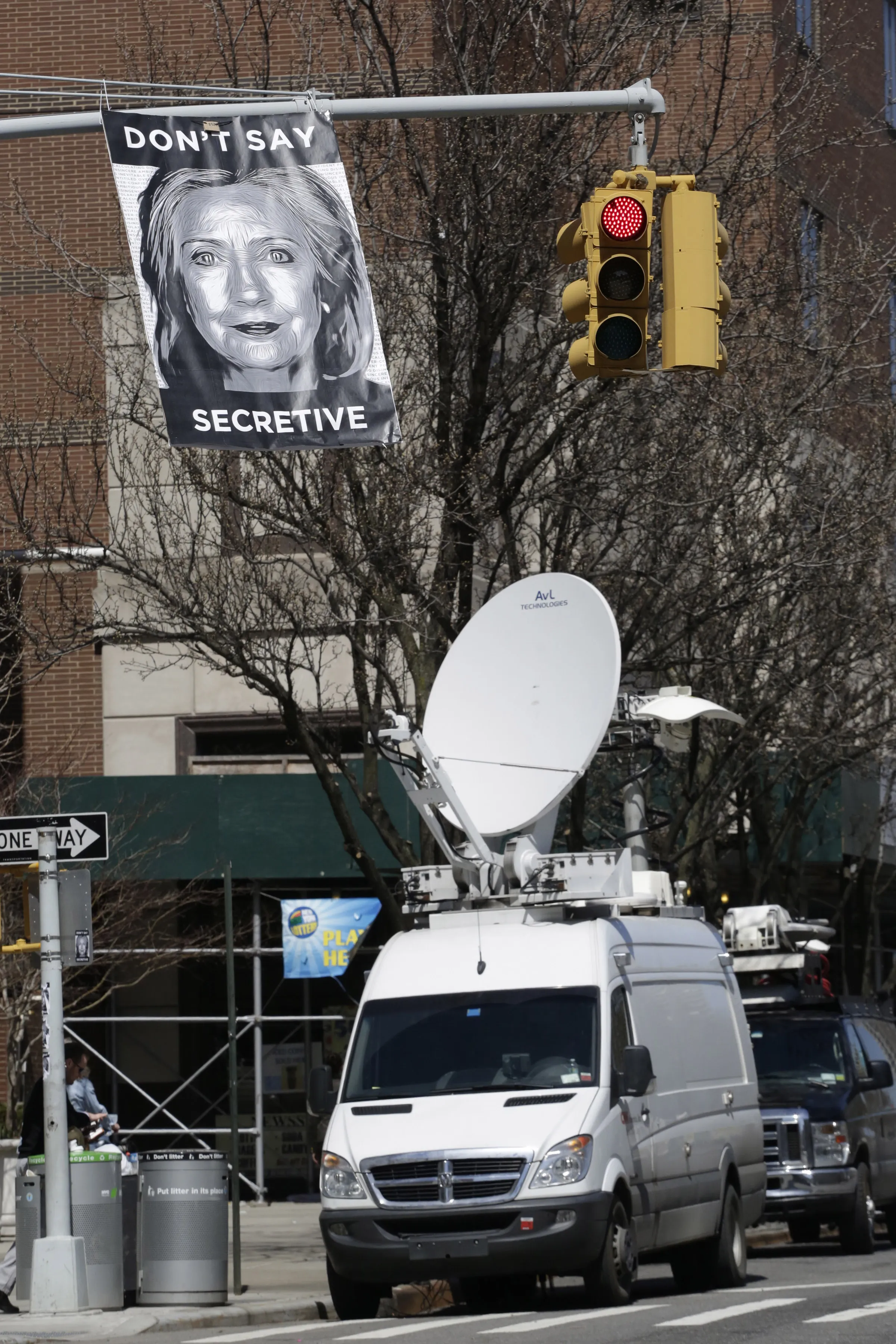 An unknown artist placed a poster on a traffic signal in front of the building where Hillary Rodham Clinton's presidential campaign offices are located, Sunday, April 12, 2015 in the Brooklyn borough of New York. A top adviser to Clinton announced her much-awaited second campaign for the White House on Sunday in an email to alumni of her first presidential campaign. (Photo by Mark Lennihan/AP Photo)
