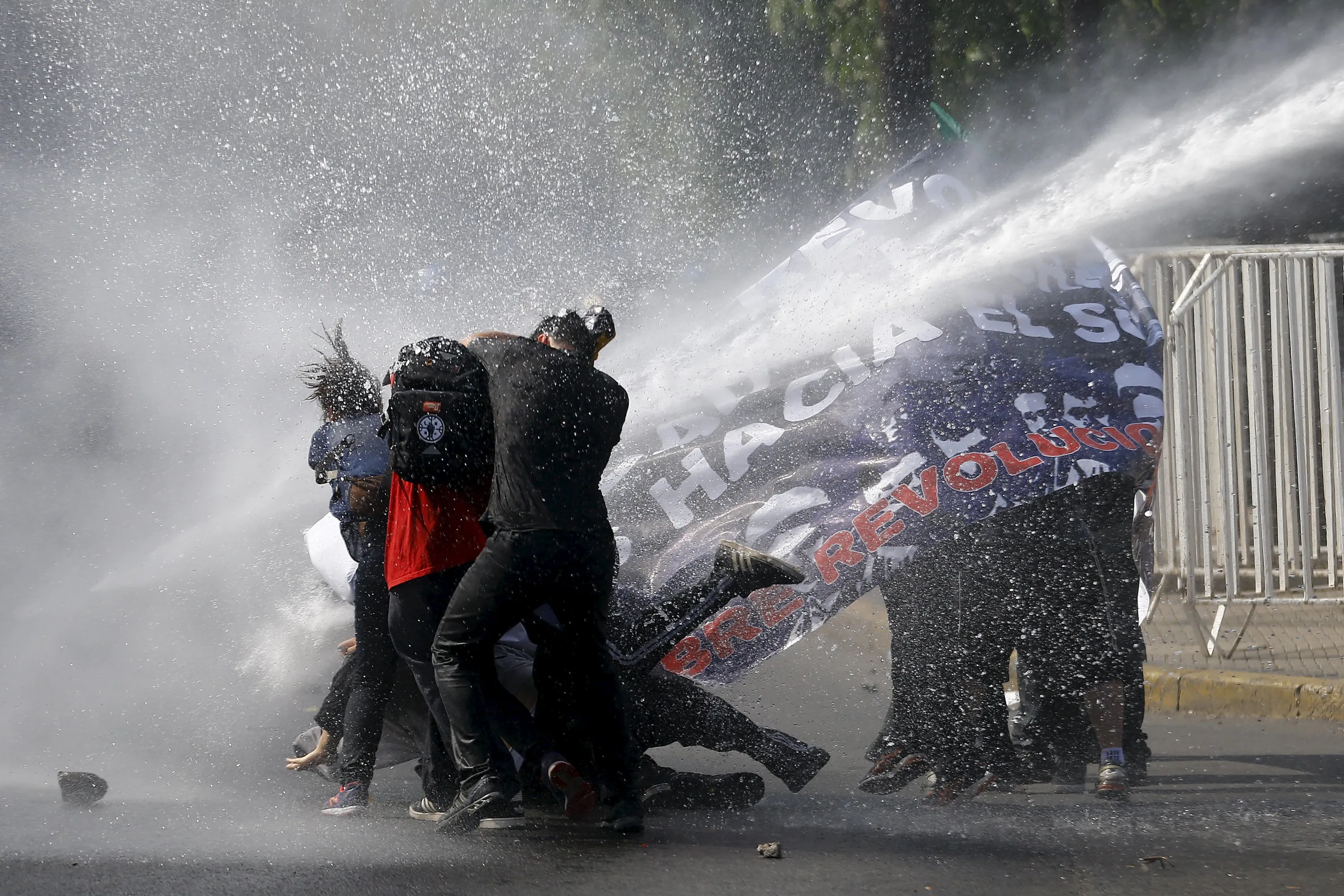 Protesters are hit by a jet of water released from a riot police vehicle during a demonstration against the government to demand changes in the education system at Santiago, April 16, 2015. (Photo by Ivan Alvarado/Reuters)